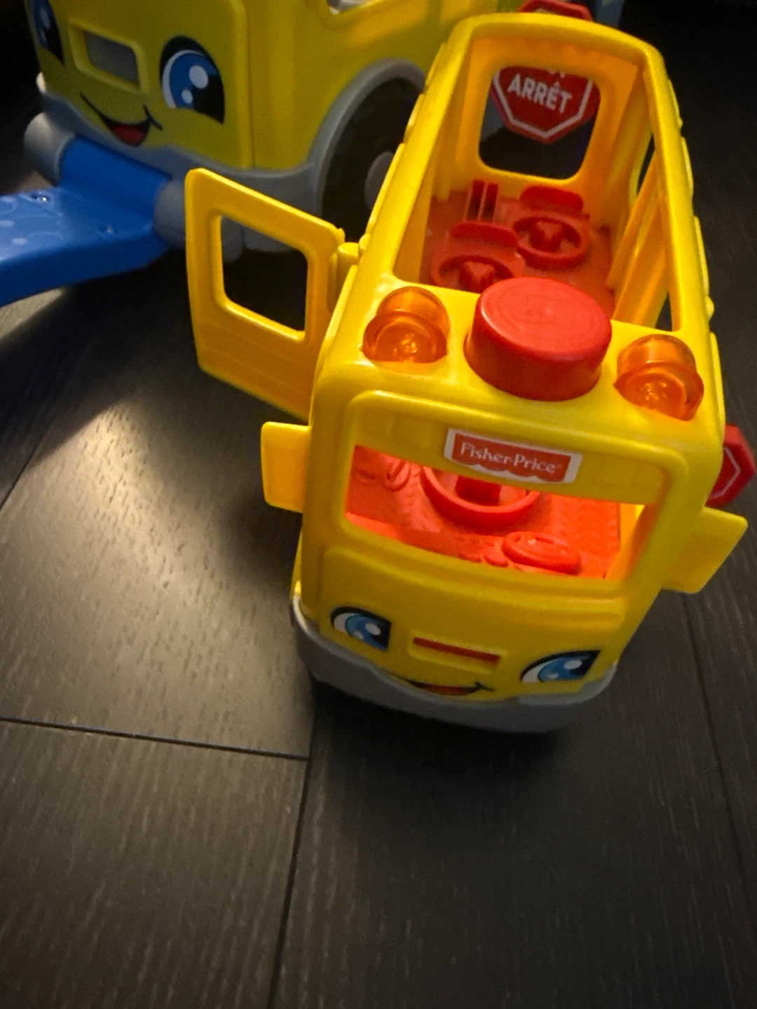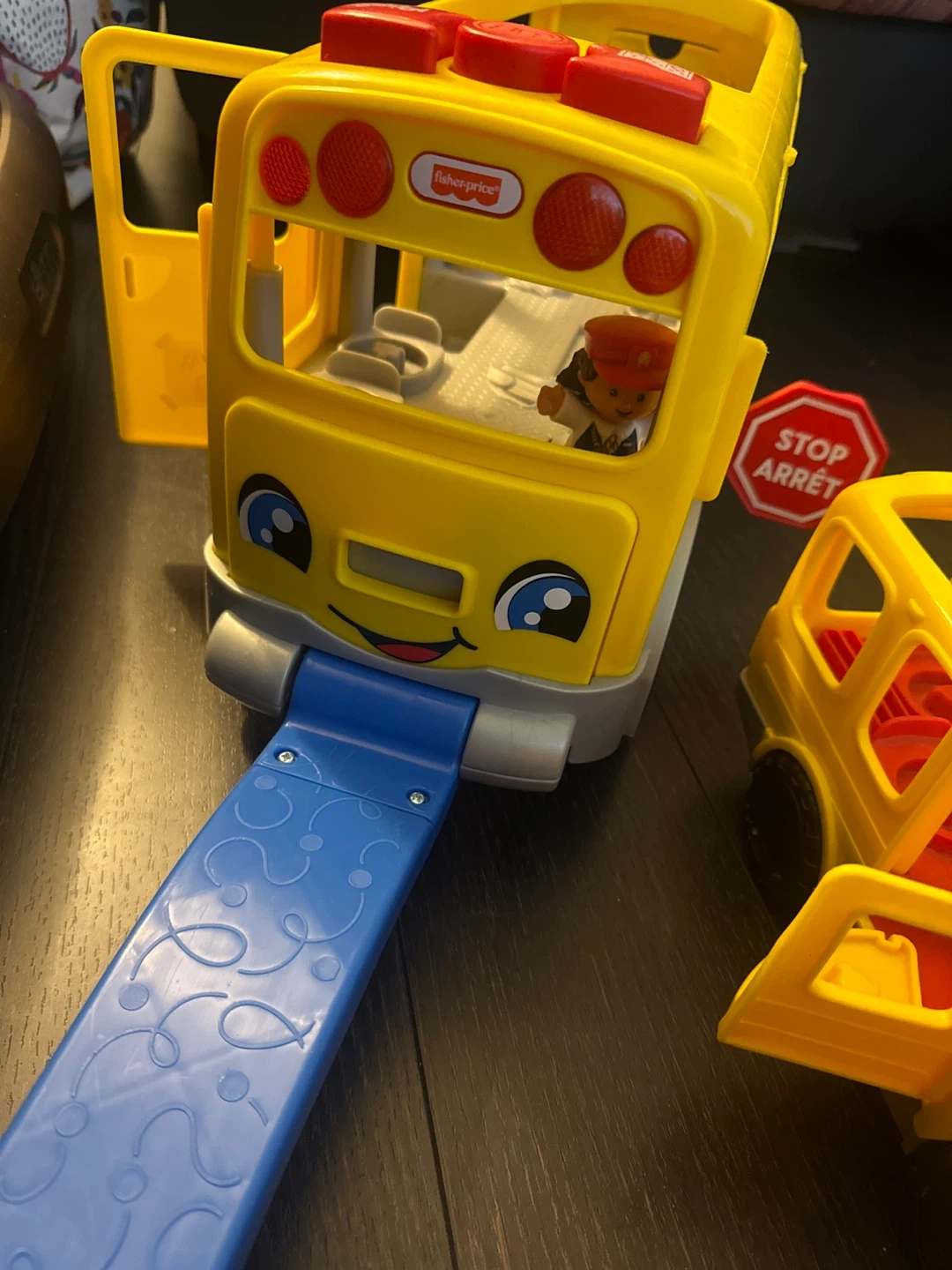 It's a Fisher-Price Little People school bus for pretend play. The bus has working doors and a ramp. Includes a little driver figure. Lights and sounds barely used
