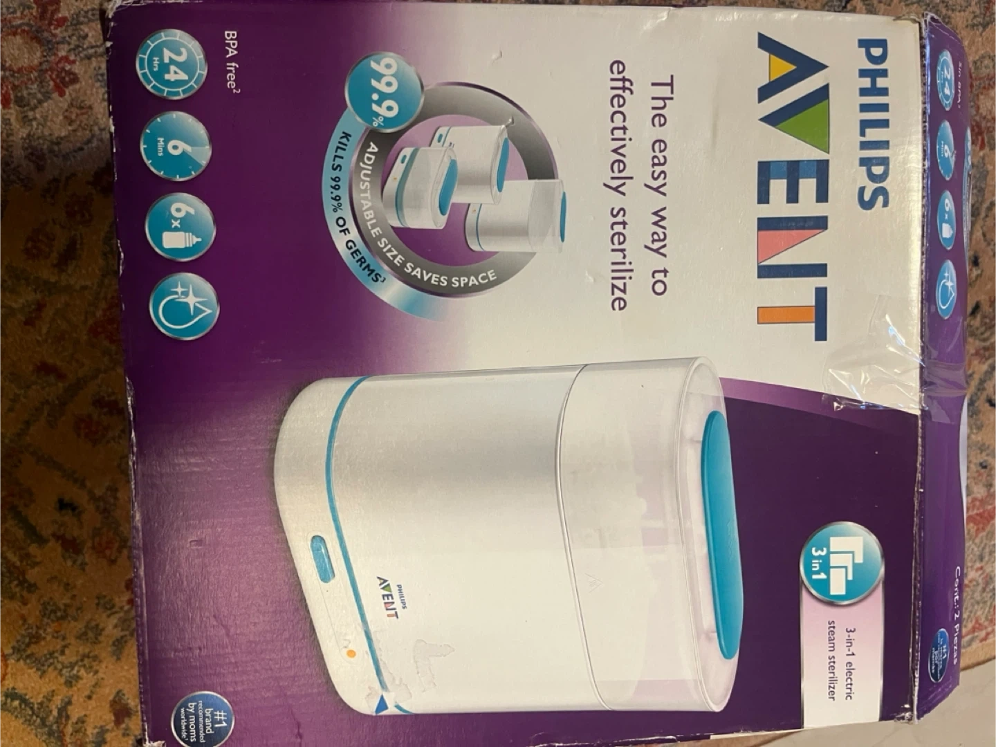 Selling a Philips Avent 3-in-1 electric steam sterilizer. It's designed to effectively sterilize baby bottles and accessories in an easy way.