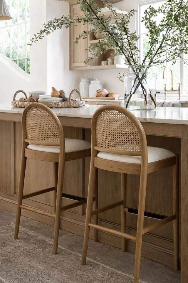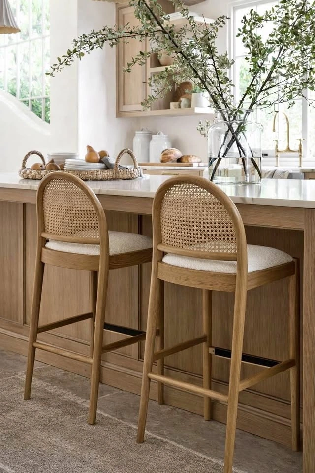 Solid wood and rattan stool set with ivory boucle seats. These are a beautiful addition to any kitchen or island seating. Brand new in box.