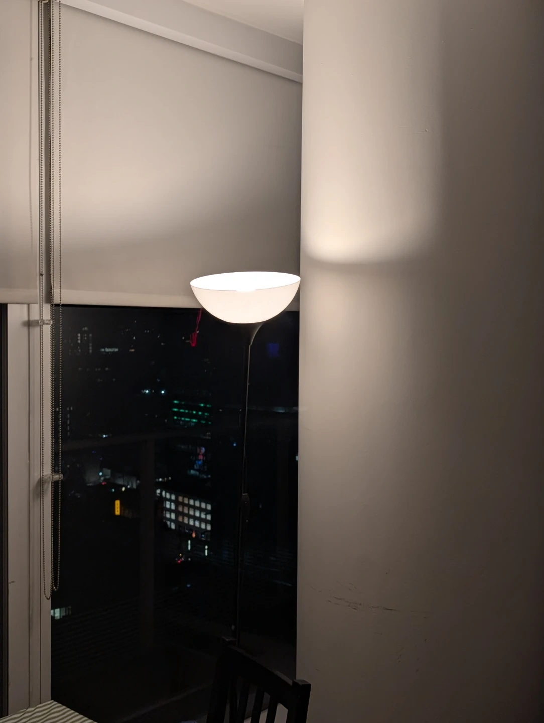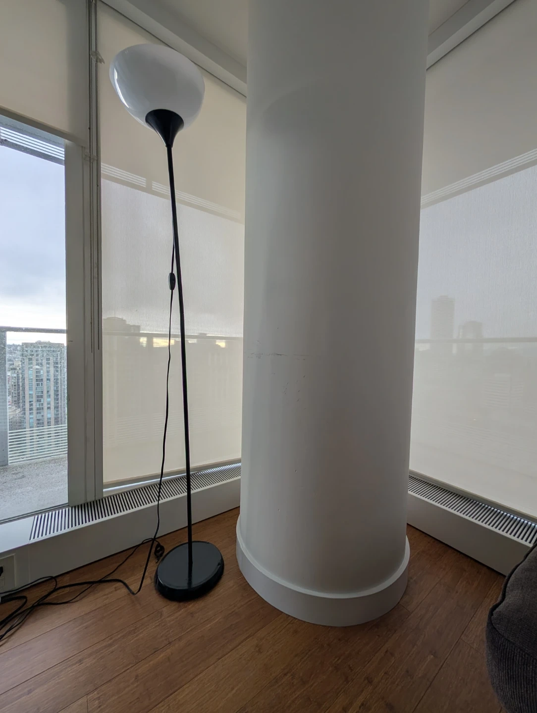 This is a white floor lamp with a black pole and base. It's got a modern, minimalist design. It's perfect for adding ambient lighting to any room.