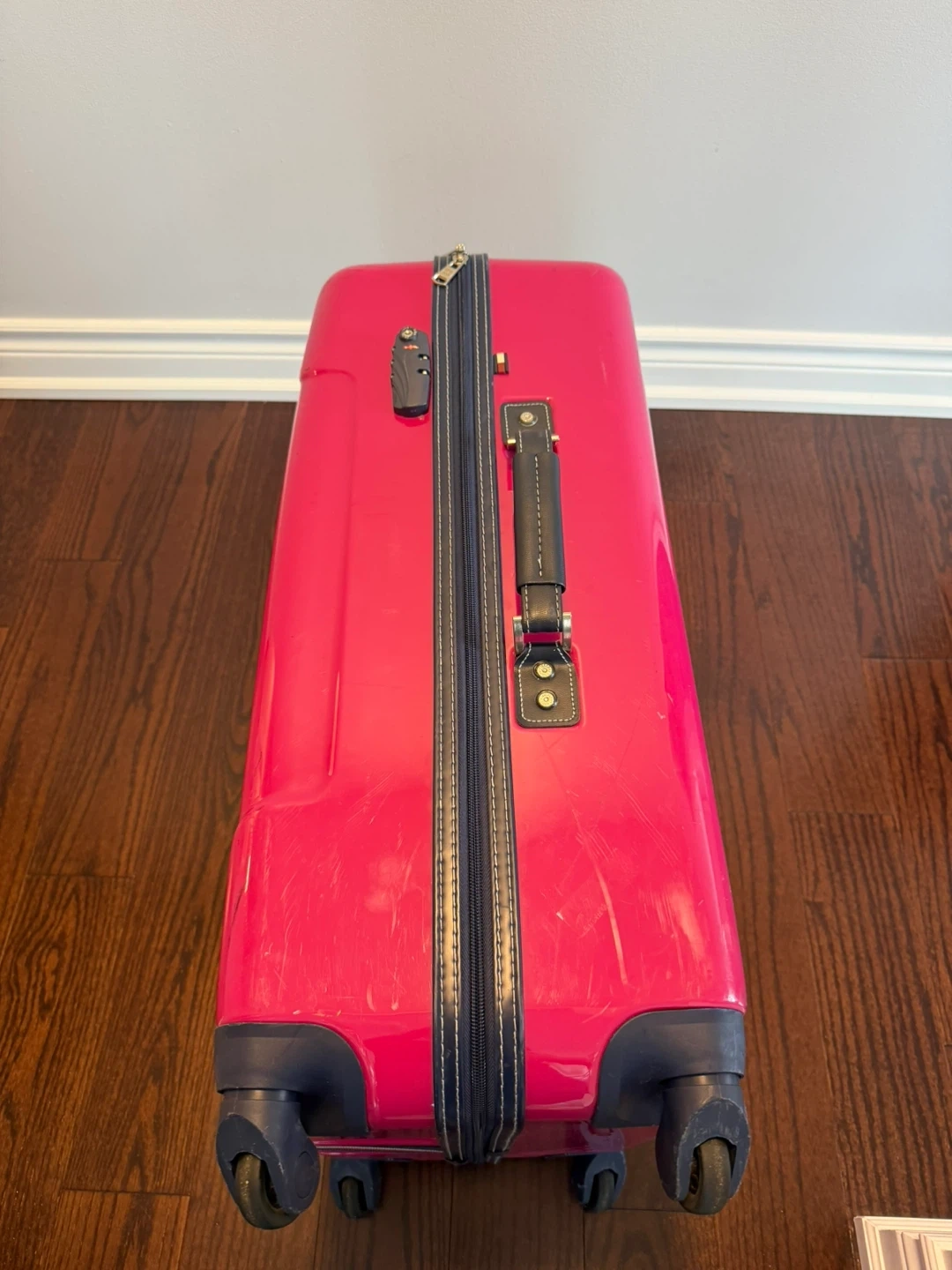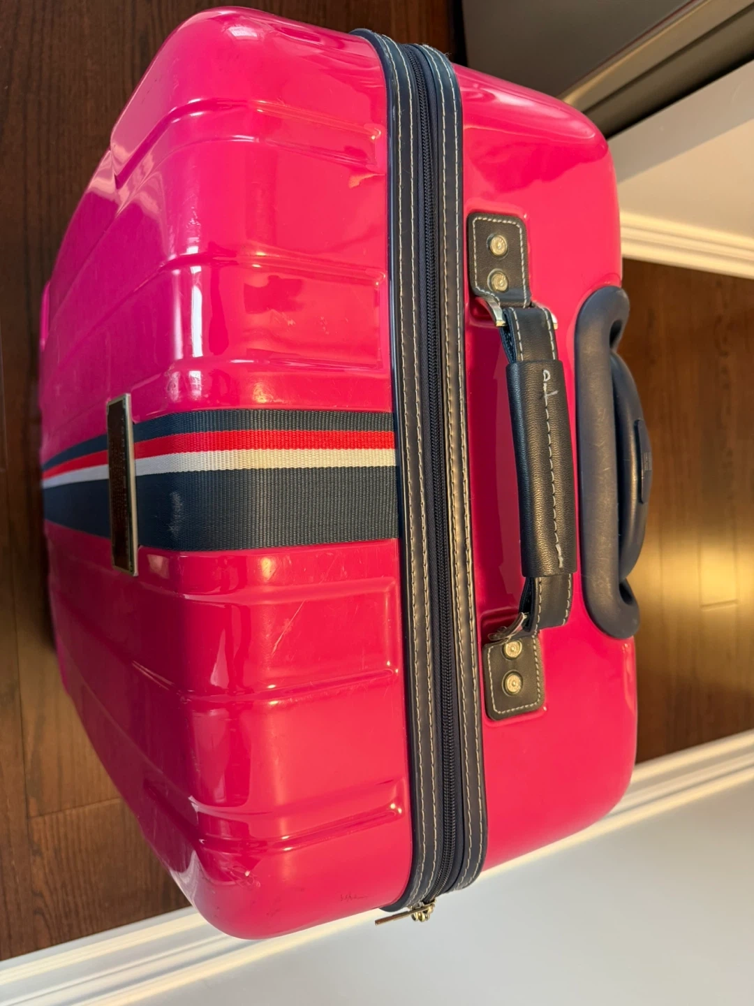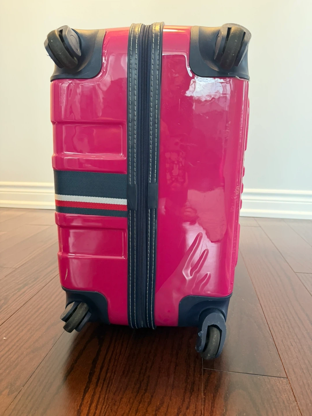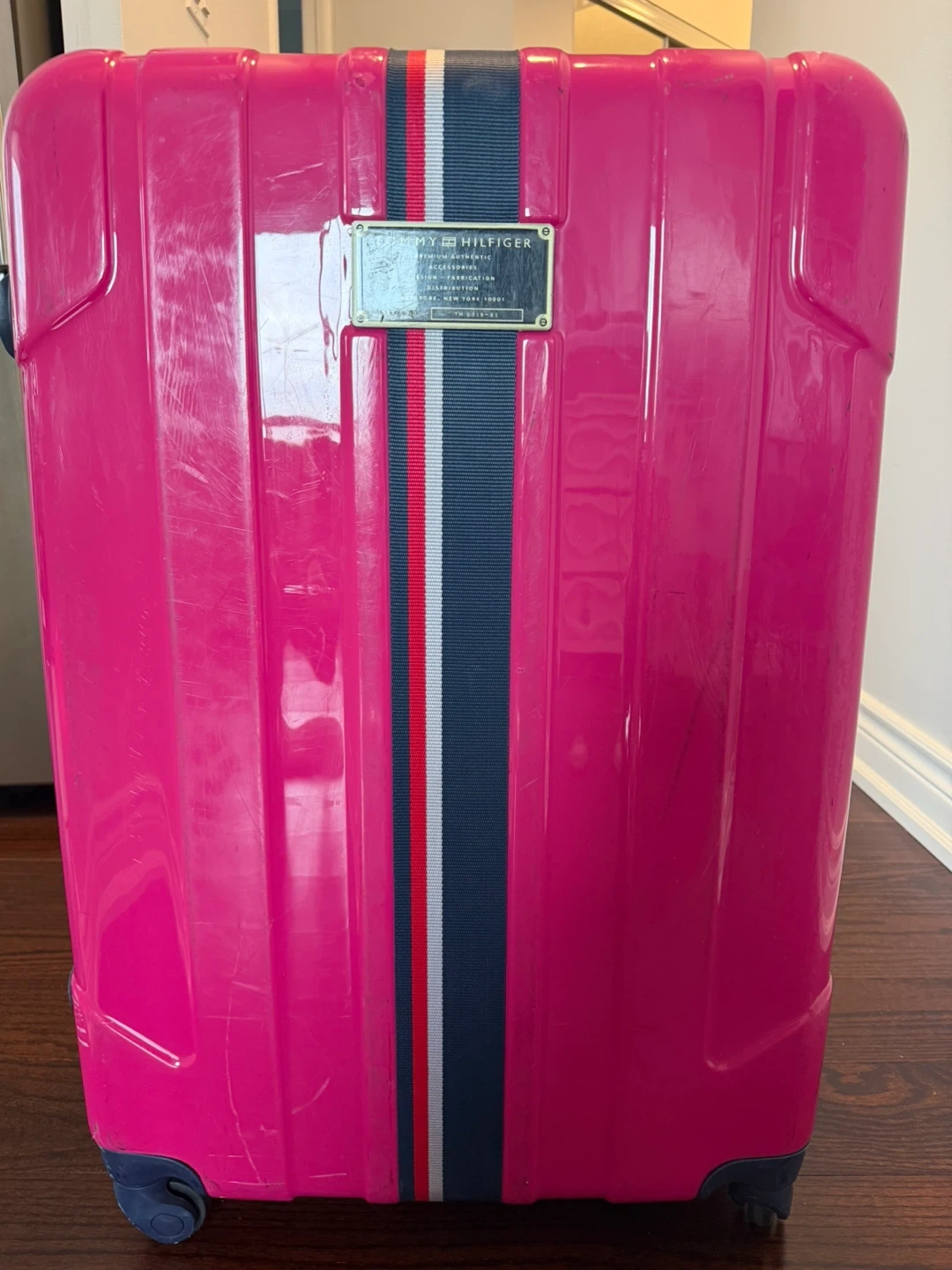 Bright pink hardside spinner luggage by Tommy Hilfiger. It's a checked luggage size with a TSA lock and four spinner wheels. Includes a retractable handle and a top carry handle.