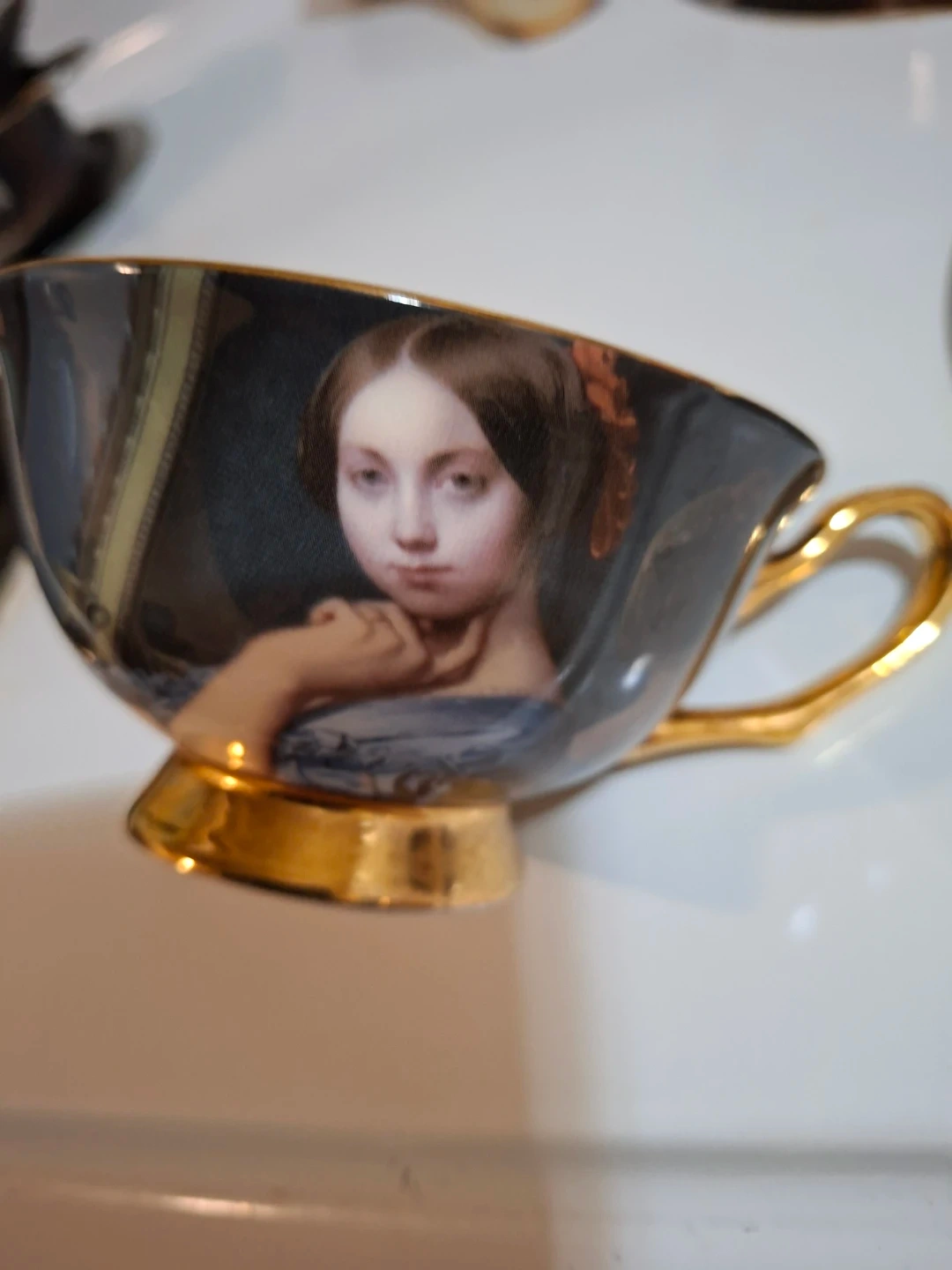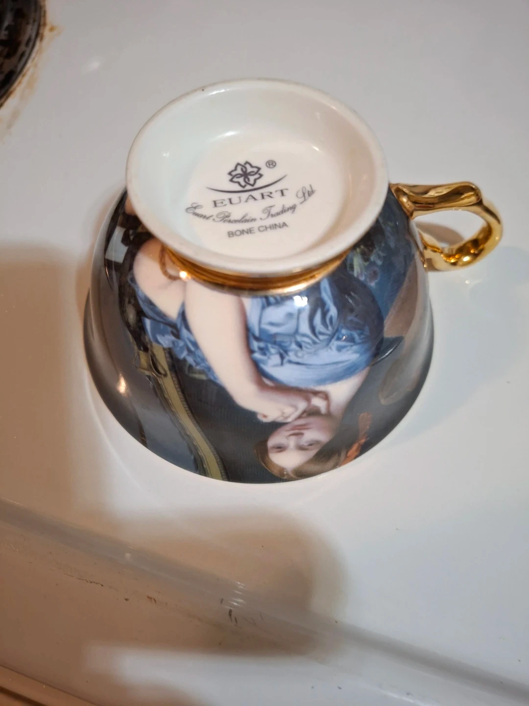 This EUART cup is made from fine porcelain bone china. It features a decorative painting of a woman and has a gold-trimmed handle and base. It's a lovely piece for display or use.