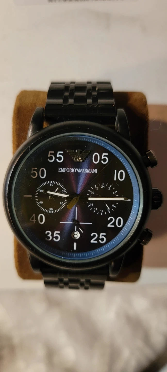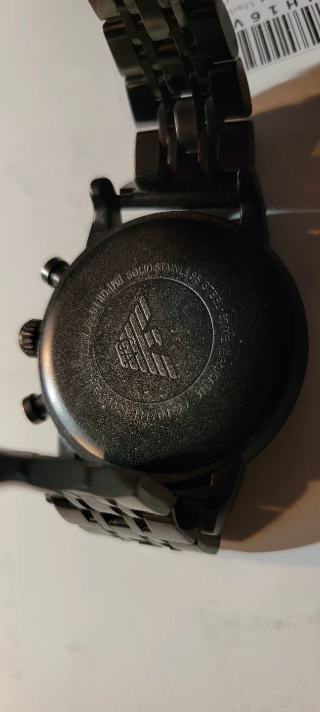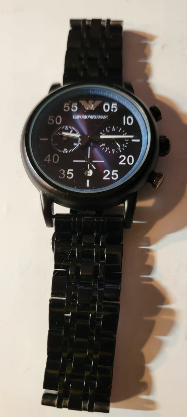 This is a black stainless steel Emporio Armani chronograph watch. It's a men's watch with a metal band. It's made of solid stainless steel.obo need battery