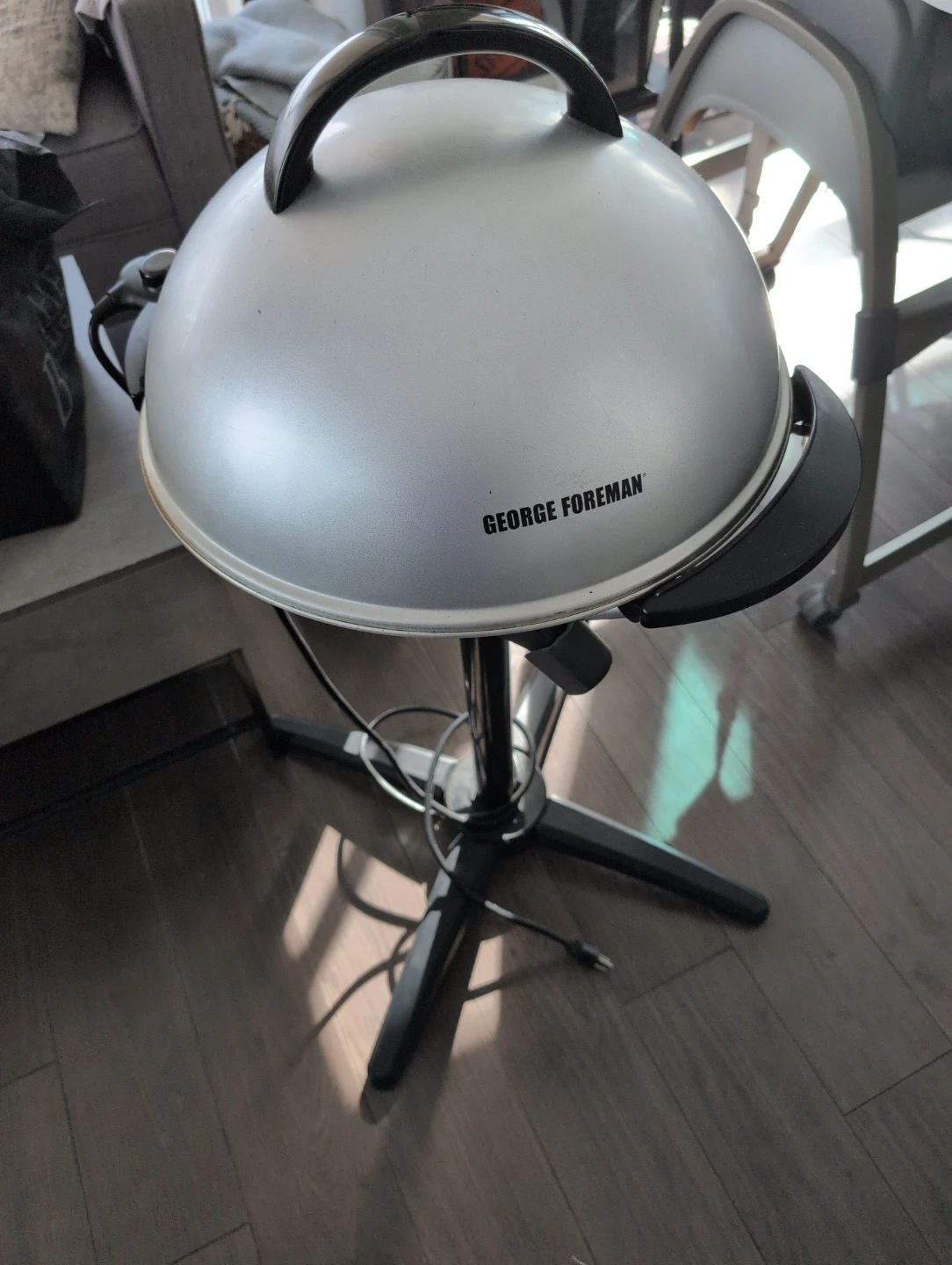 This is a silver George Foreman electric grill with a stand. It's a dome-shaped grill with a handle. It has a power cord for use.