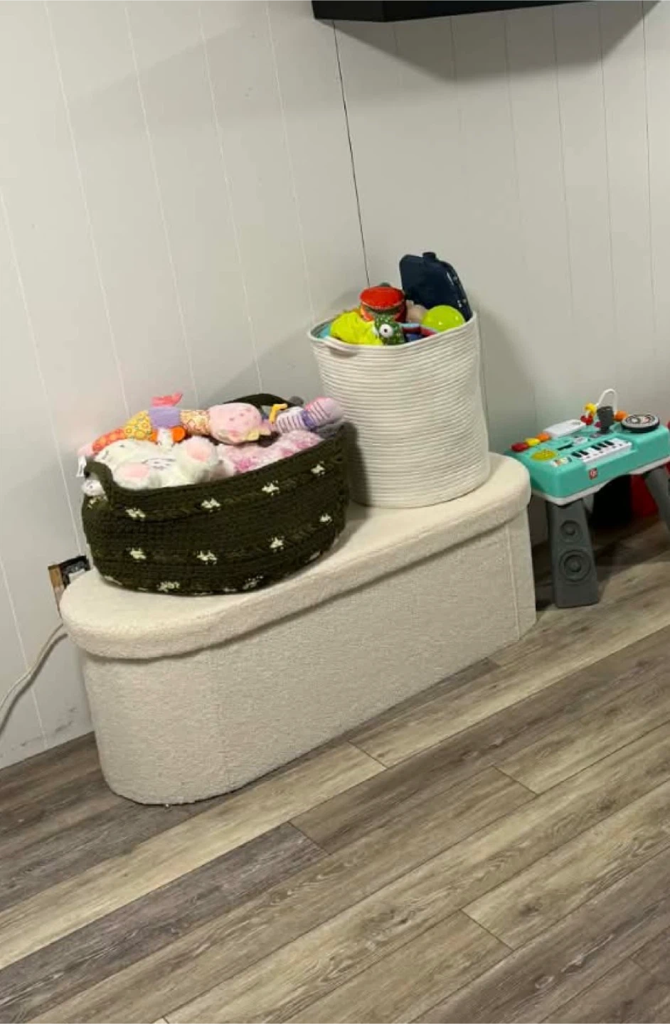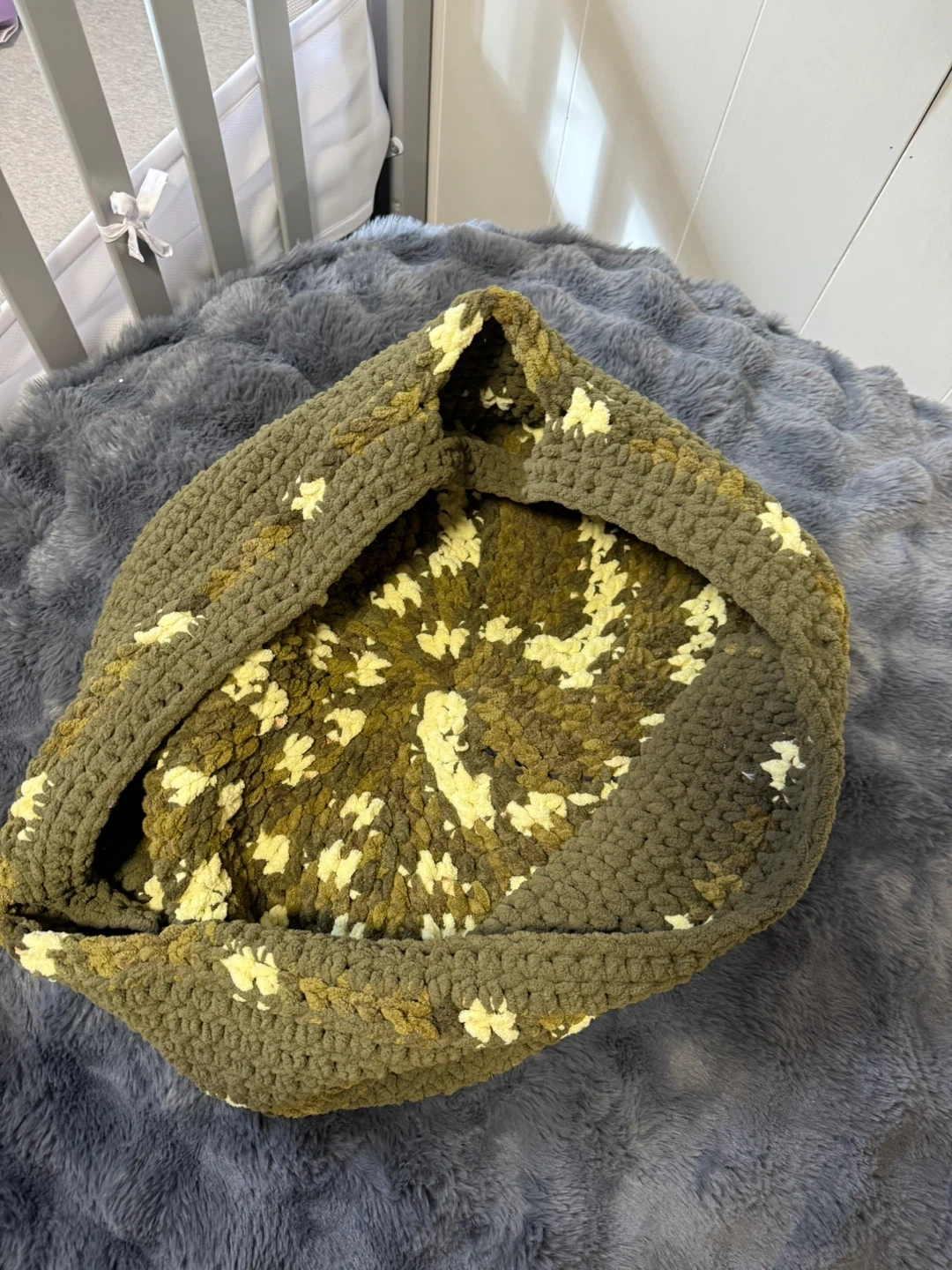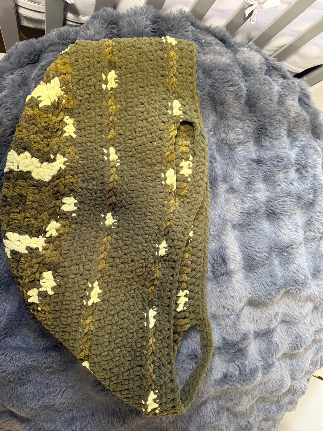 This is a handmade crochet storage basket, perfect for organizing toys or blankets. It features a textured knit with a green and cream speckled pattern. It's sturdy and would be a lovely addition to a nursery or playroom!