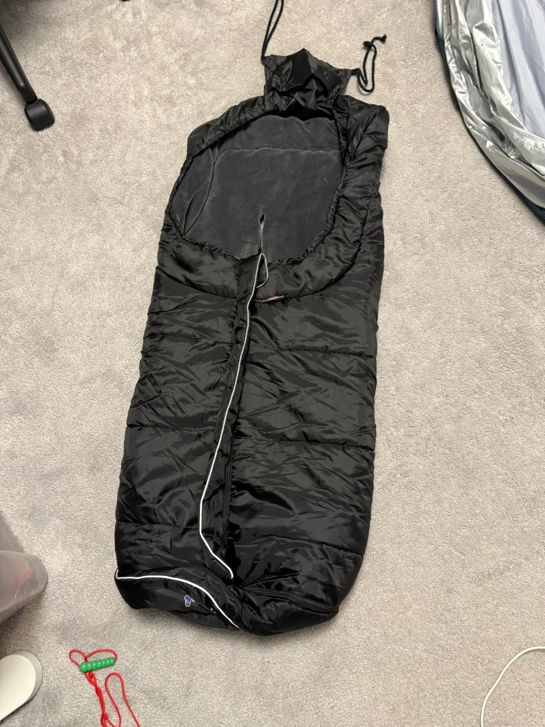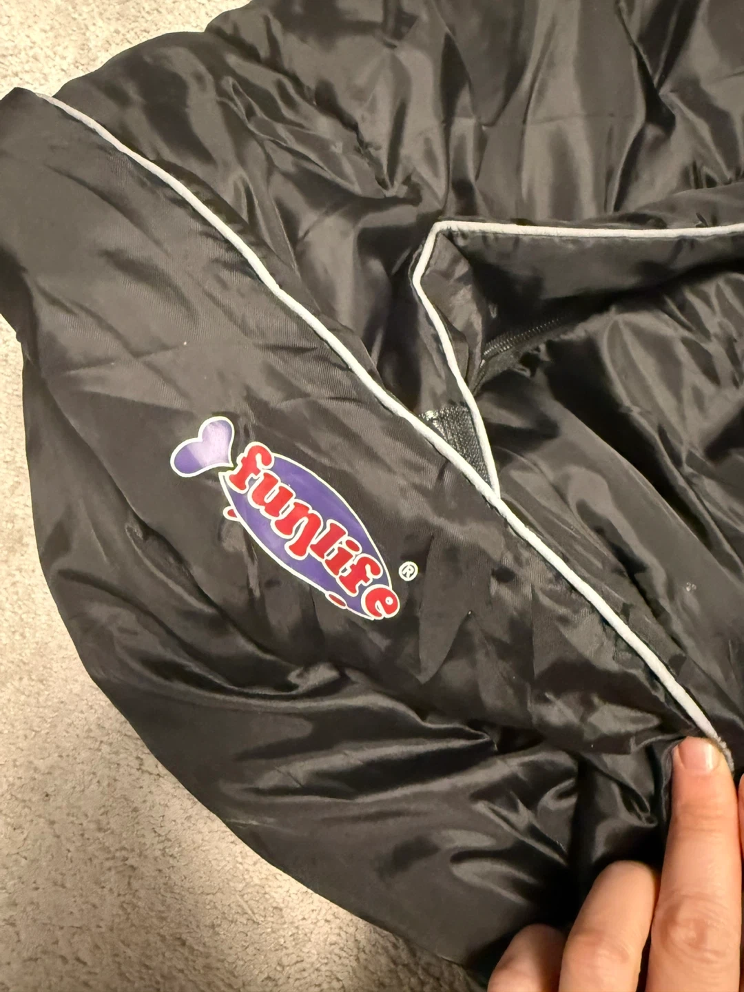 This black Funlife sleep sack is designed for babies. It features a soft interior and a zippered front closure. It's made with a durable outer shell and includes a hood.