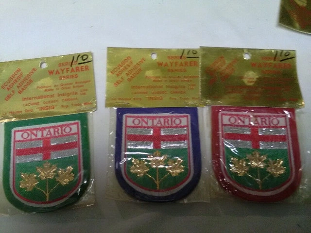 Up for sale we have 15 Ontario Material Patches There is 5 red, 5 blue and 5 green patches The are 2.5 inches by 33/4 inches in dimension the back of the package Reads( Remove plastic covering on back of badge Sewing on is Recommended all on New condition