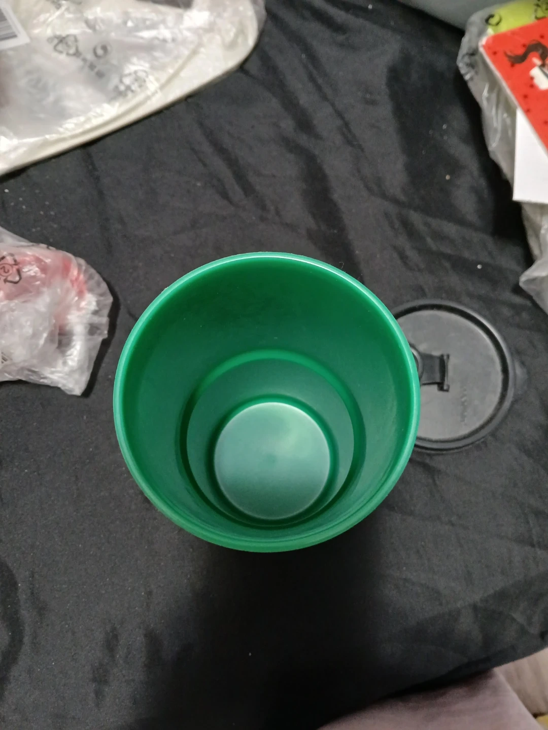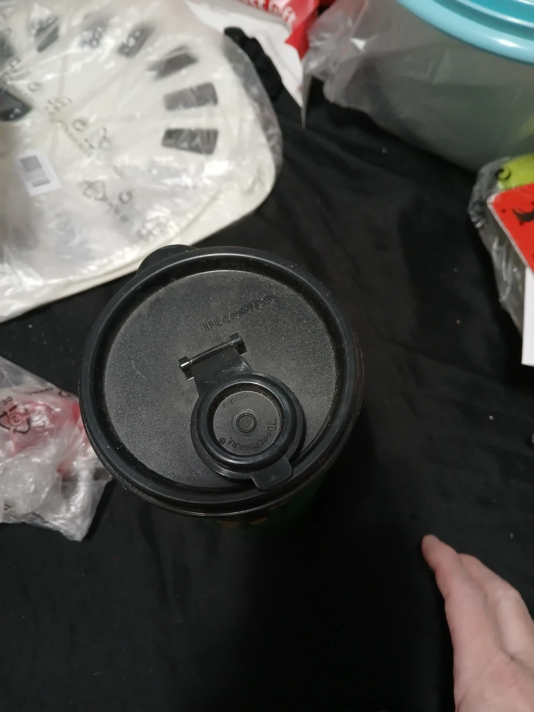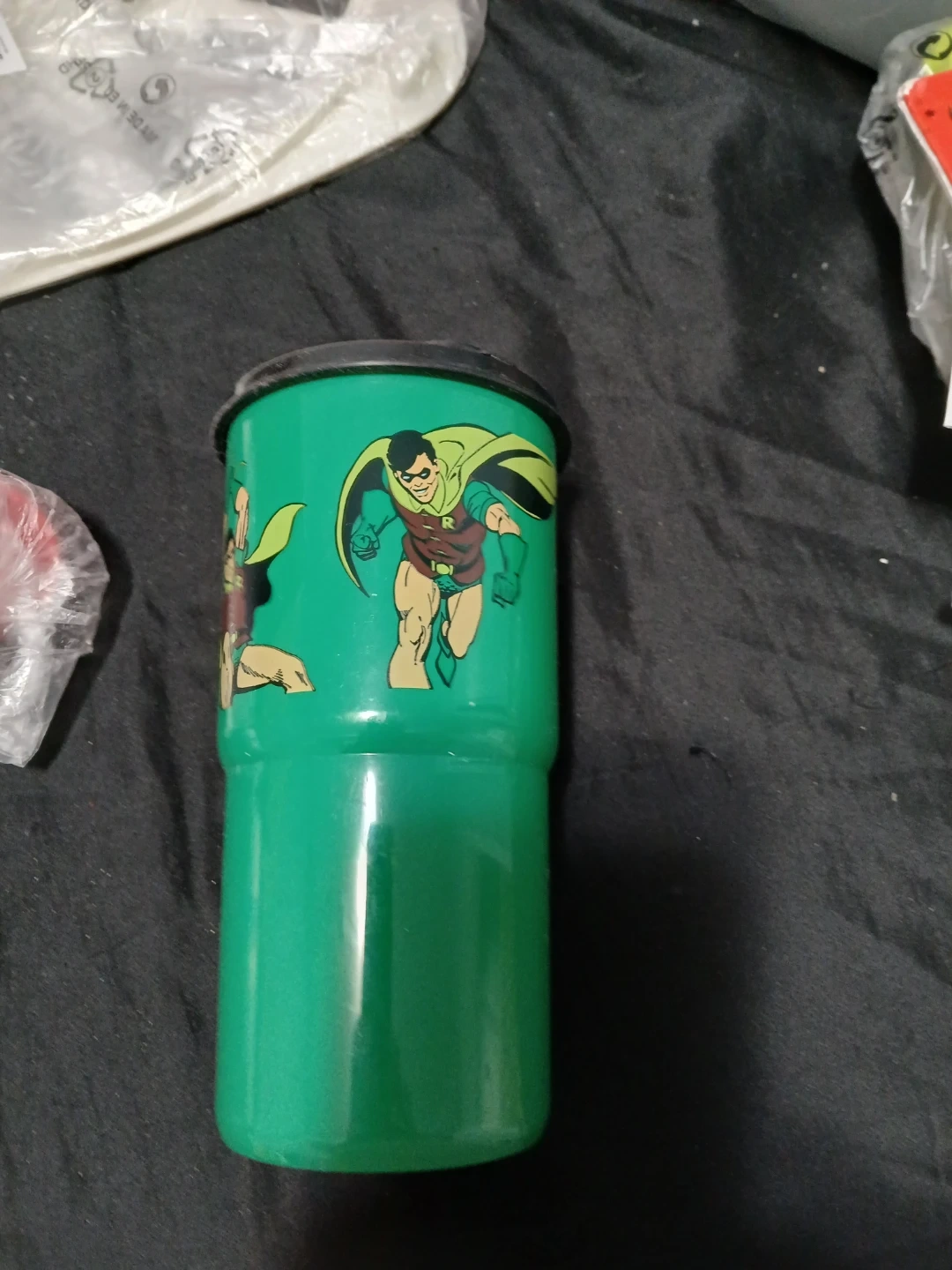 This is a green Tupperware tumbler featuring the character Robin. It's made of plastic and comes with a black lid. Perfect for kids on the go!