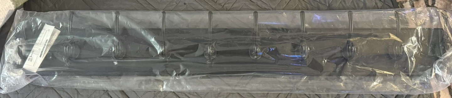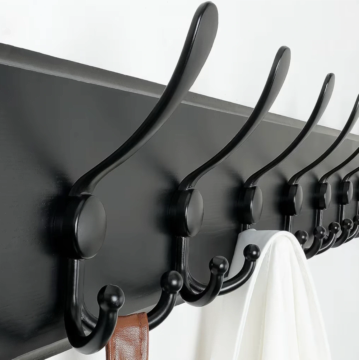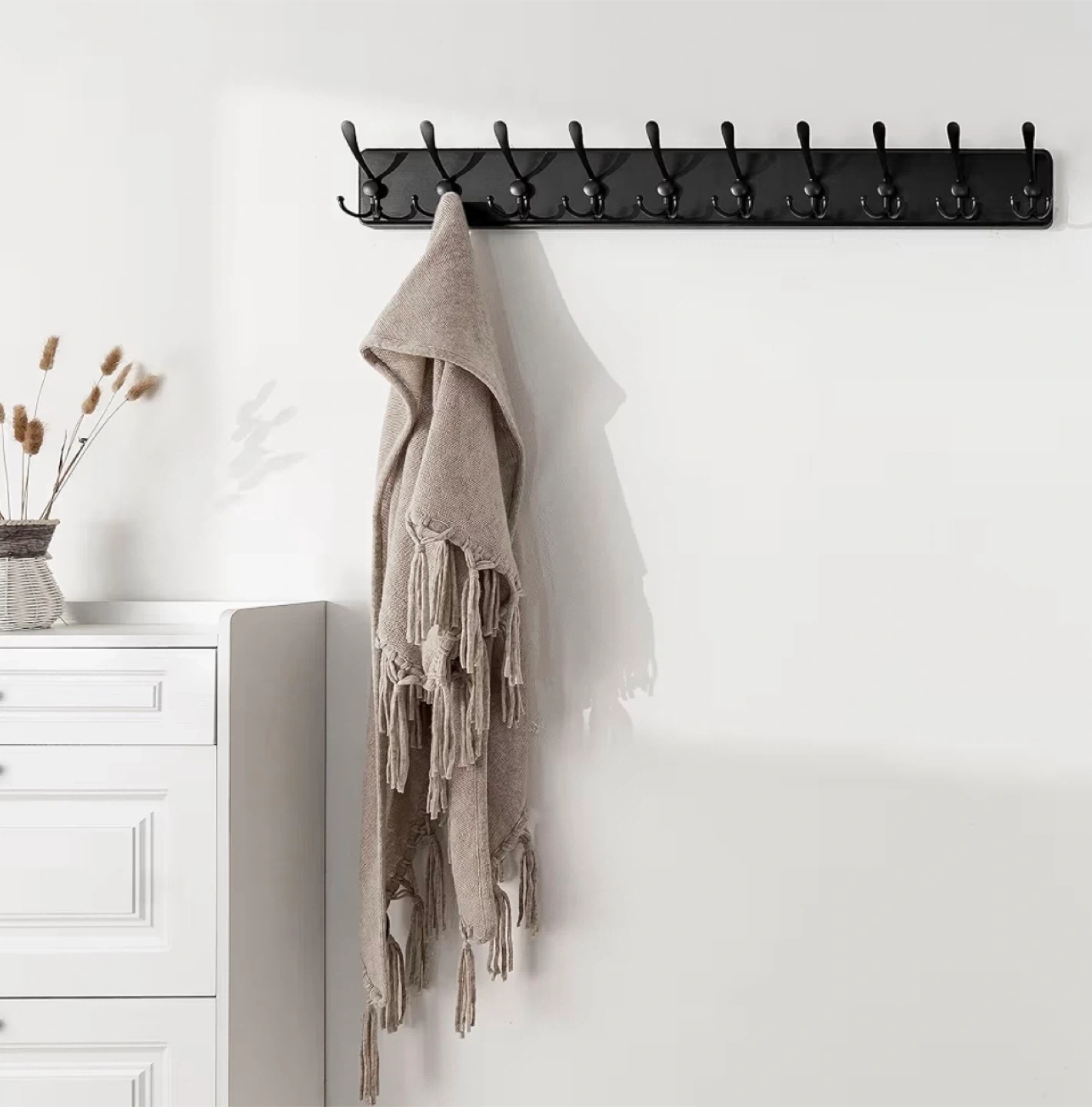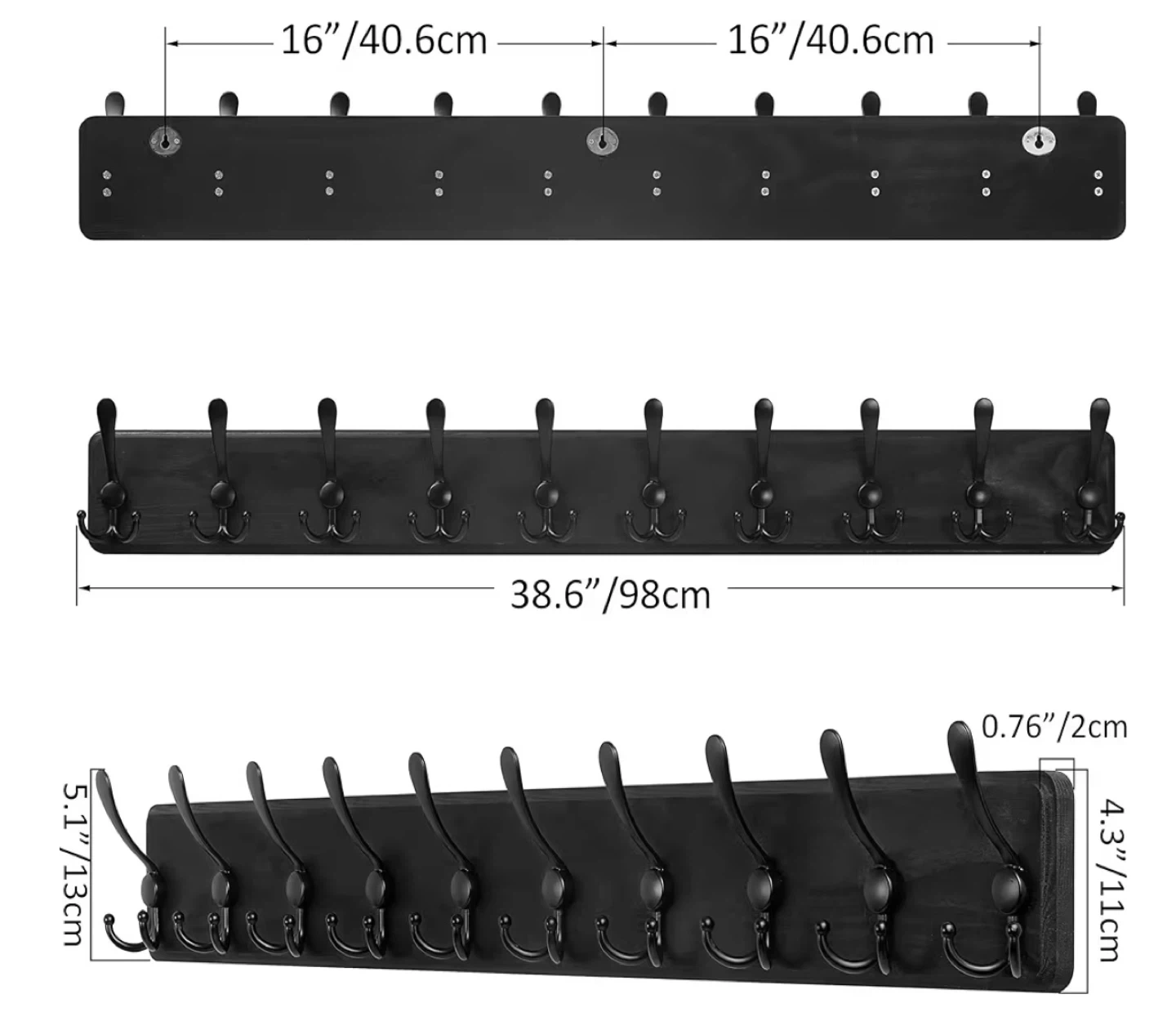 This black wooden coat rack features 10 durable hooks for hanging coats, hats, or scarves. It's made of solid wood and has a classic black finish. The overall length is 38.6 inches, with a depth of 4.3 inches.