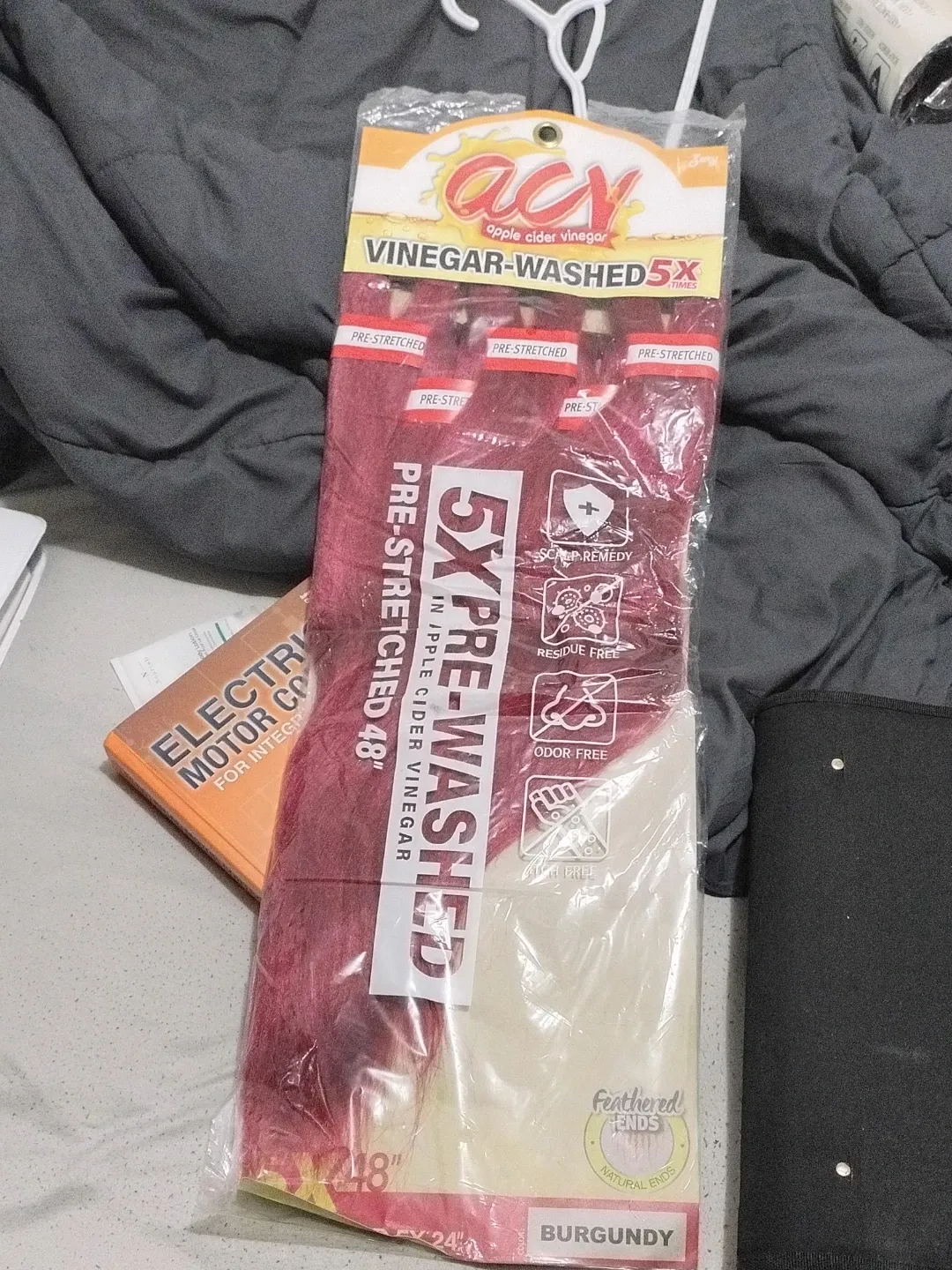 ACY braiding hair comes 5X pre-washed in apple cider vinegar. It's 48 inches long and burgundy coloured with feathered ends. This hair is residue and odor-free for a comfortable application.