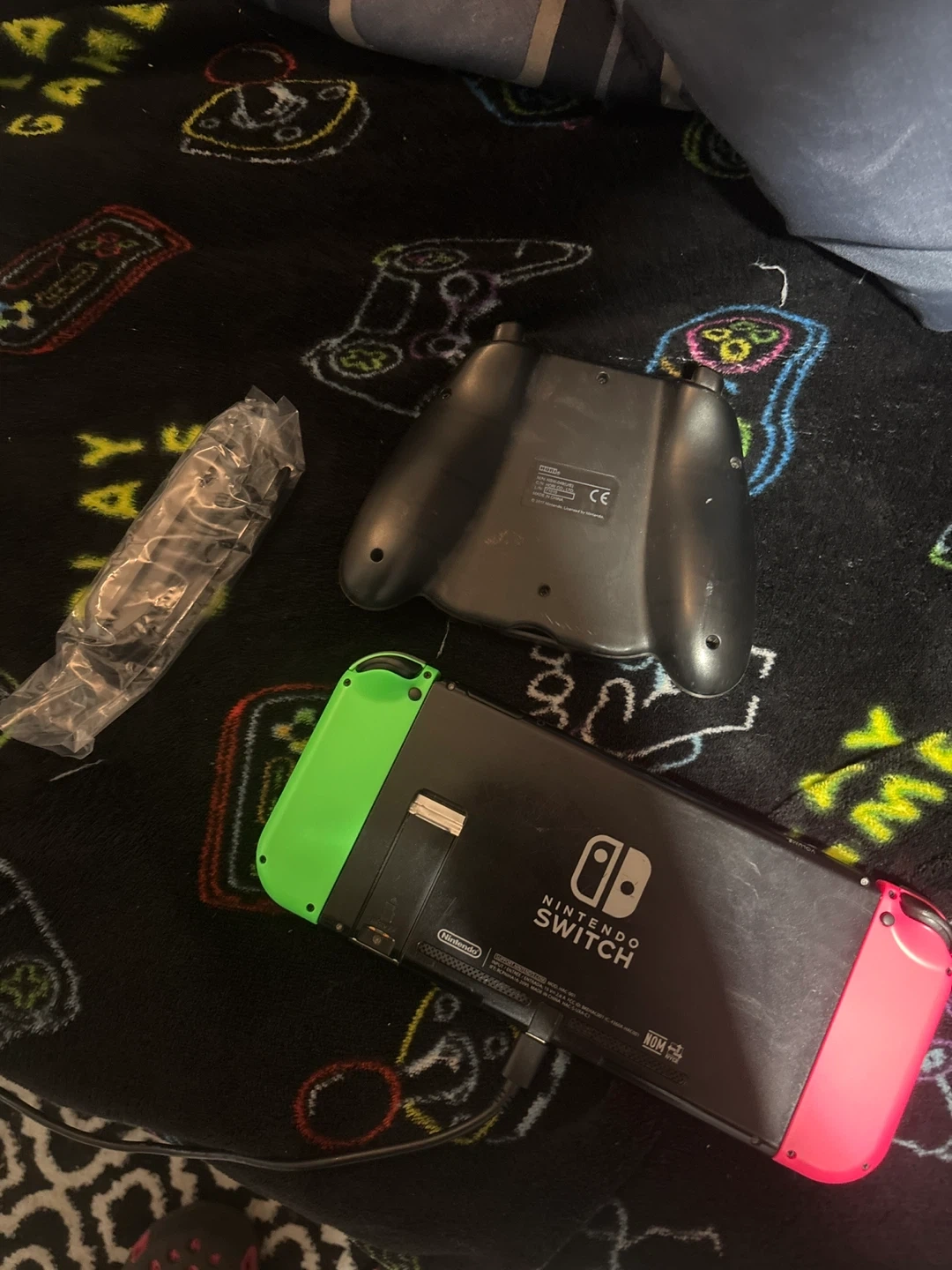 This is a Nintendo Switch console. It comes with neon red and neon green Joy-Cons. Also includes a Joy-Con grip and a charging cable. The console is in good condition.