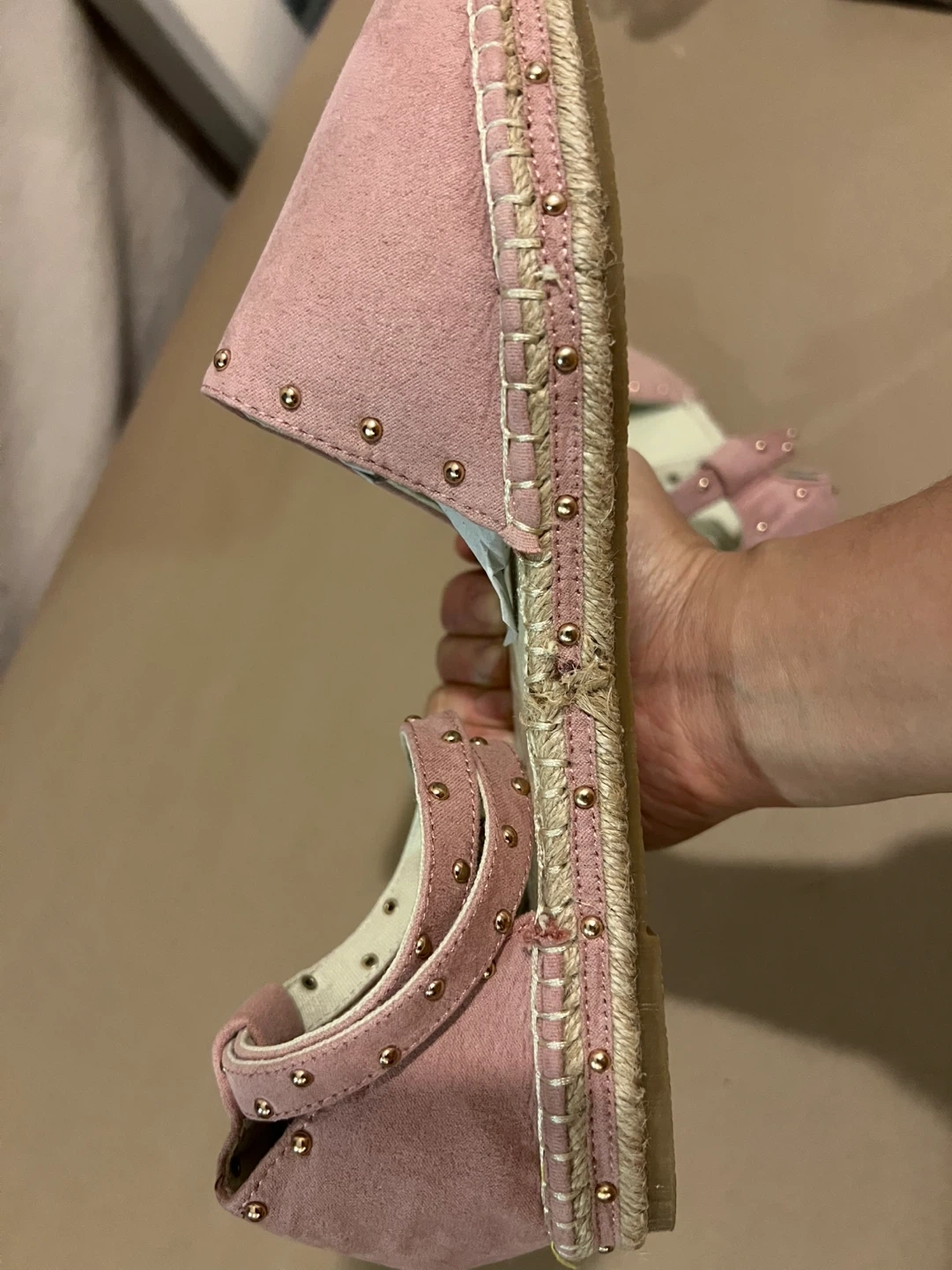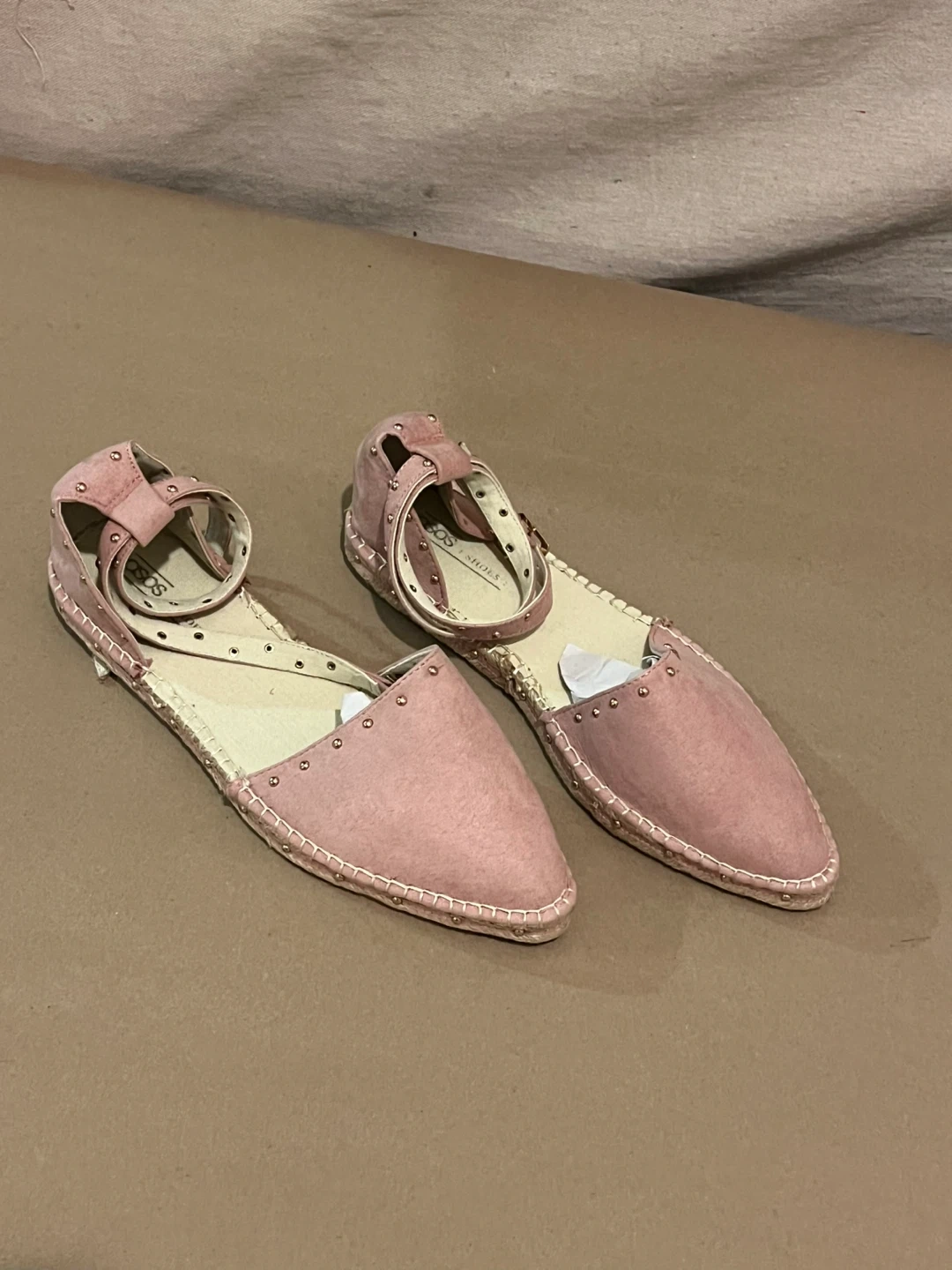 Brand new pink suede espadrille flats with gold stud embellishment. Features ankle strap and a pointed toe. Real cute!
