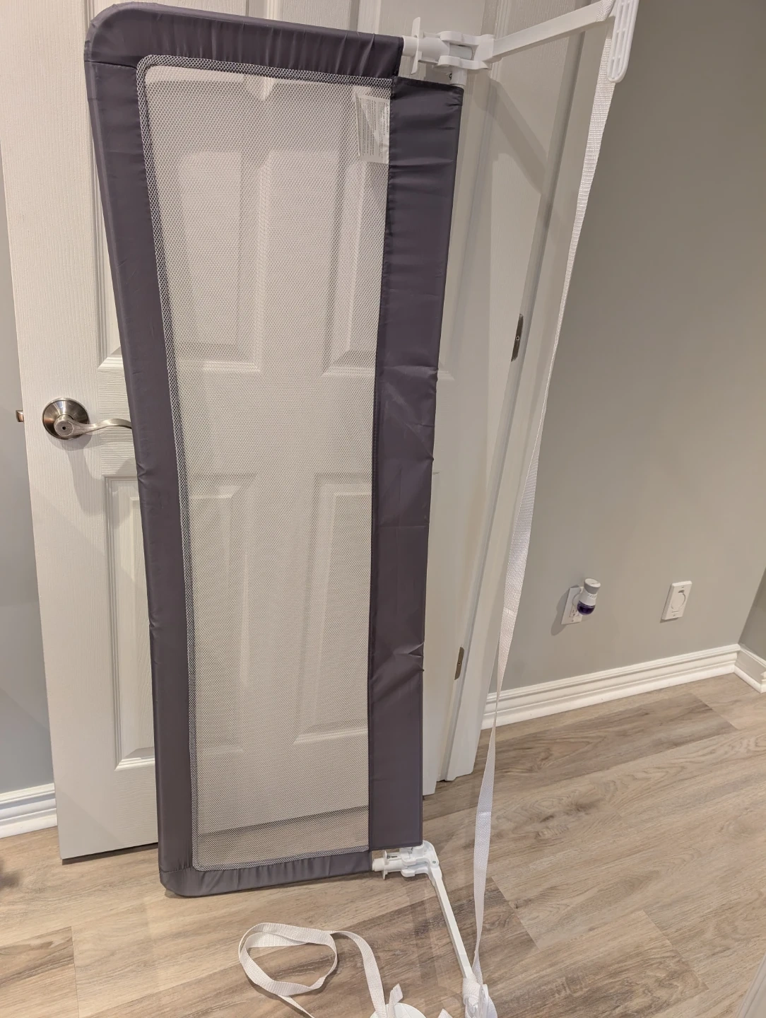 This is a grey mesh bed rail for safety. It's designed to prevent falls from beds. Includes straps for secure attachment.