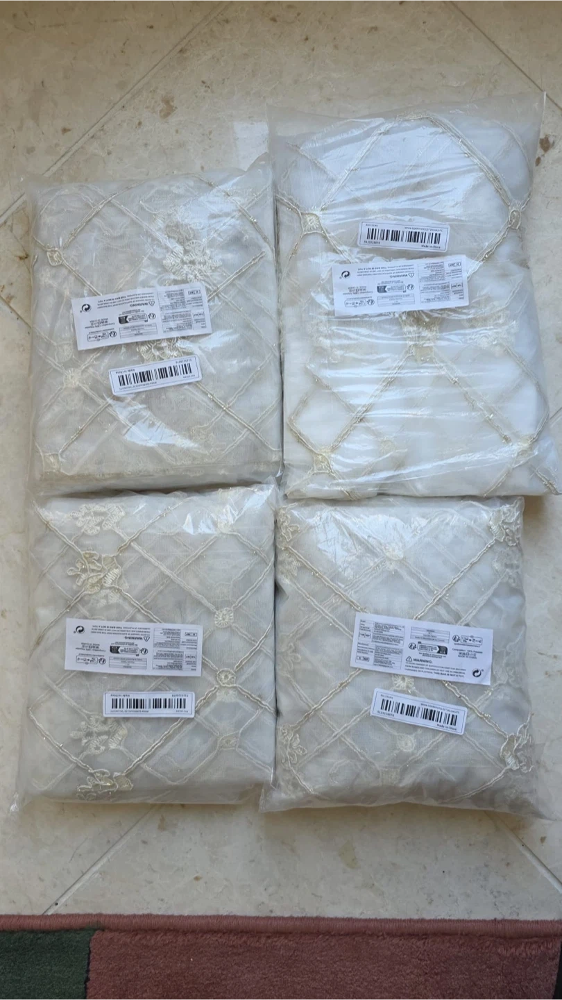 This is a set of four white lace placemats. They feature a diamond pattern with embroidered floral accents. The lace material is delicate and decorative.