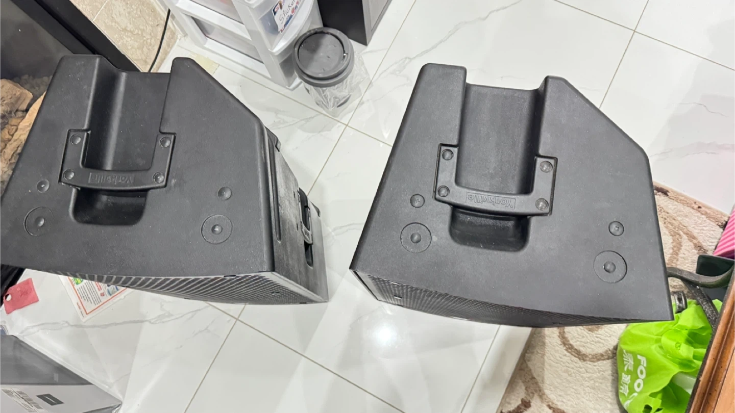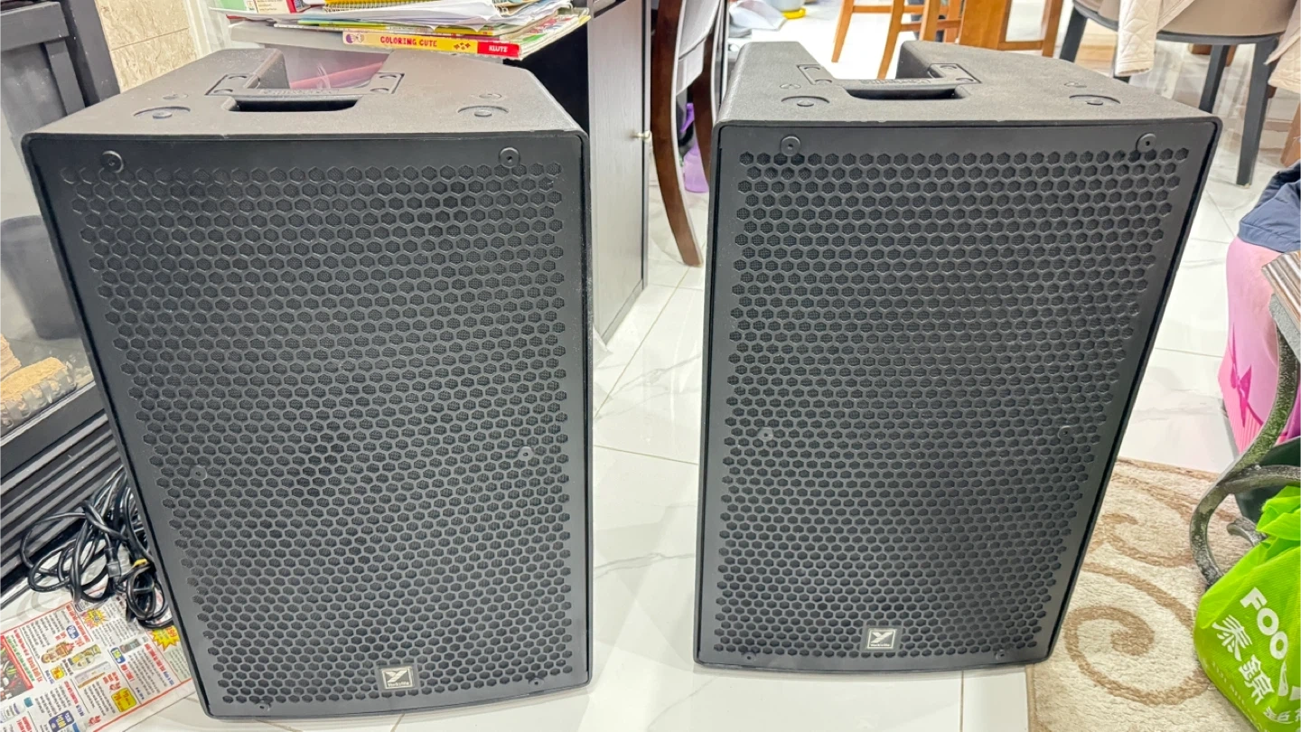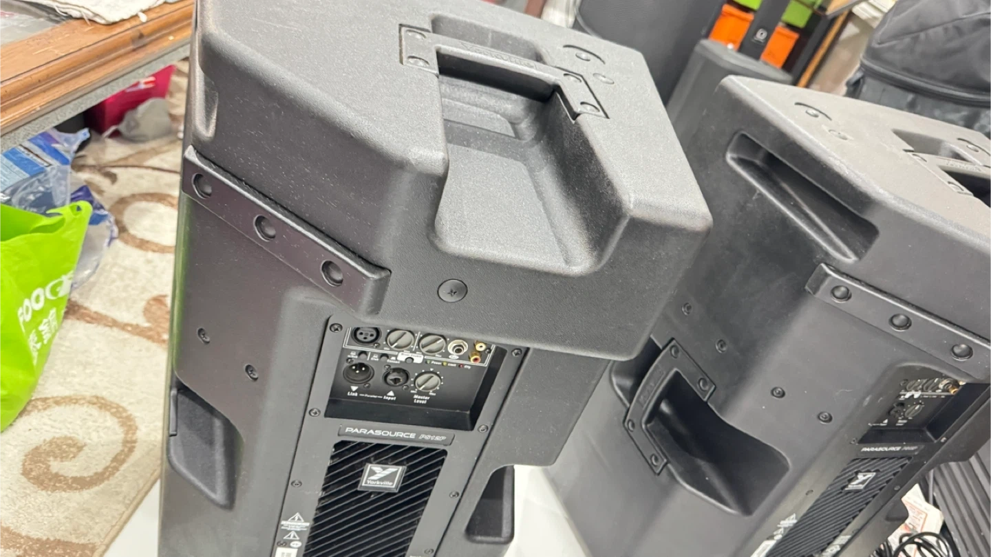 A pair of Yorkville Parasource PS12P powered speakers. These units are black and feature handles for easy transport. They are suitable for live sound or DJ applications.