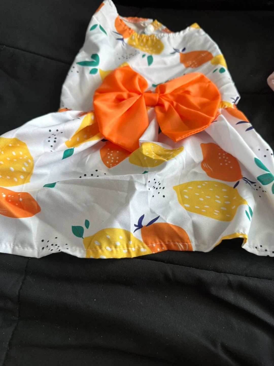 Three adorable pet dresses with fun fruit and cherry patterns. Includes a white dress with lemons and oranges, a blue checkered dress with cherries, and a colourful striped dress with a cherry detail. They're super cute for your furry friend! Size M. 3/$20. Not willing to Split