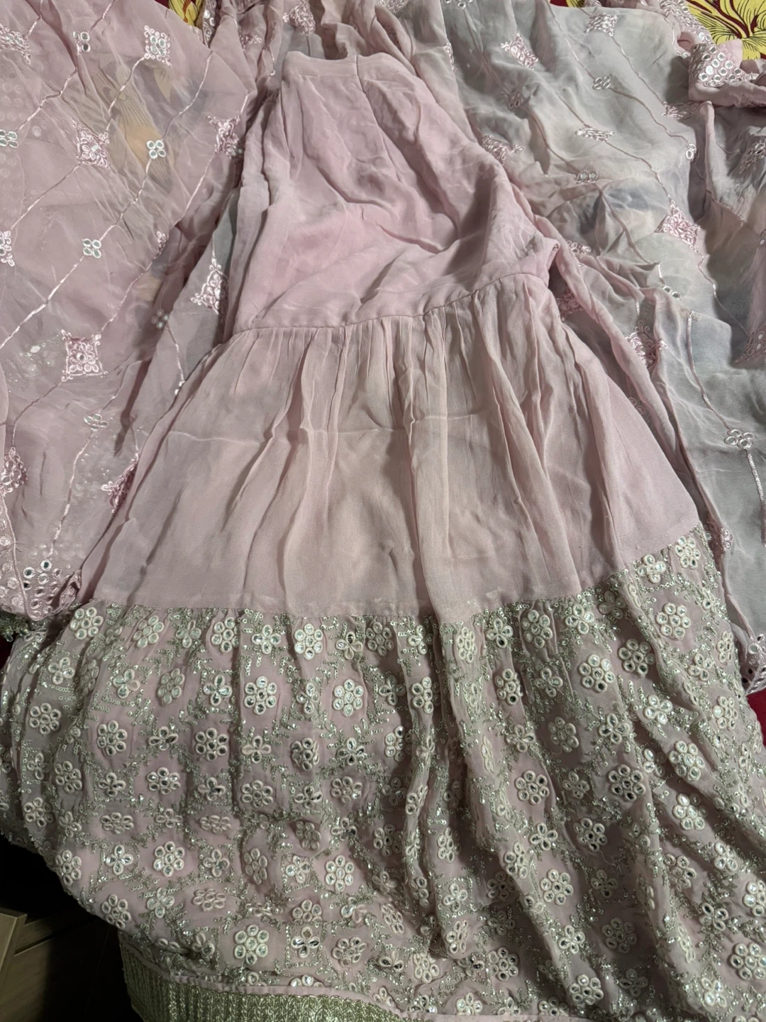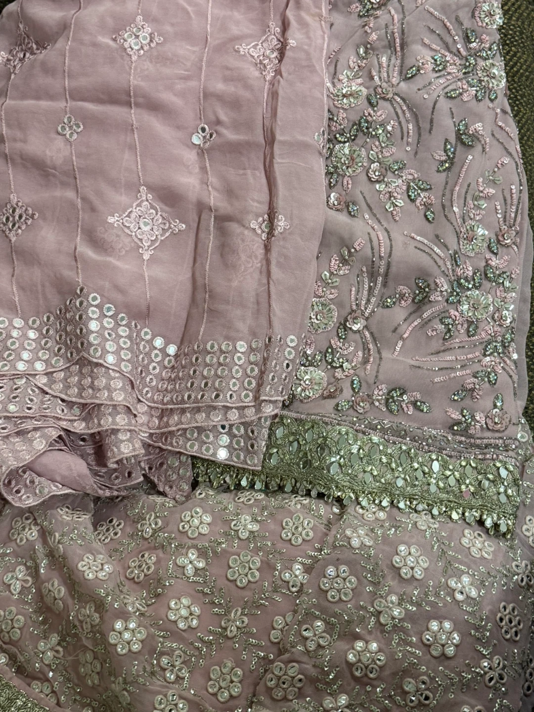 This is a beautiful pink formal dress with intricate embroidery and mirror work all over. It includes a matching dupatta. Perfect for special occasions!