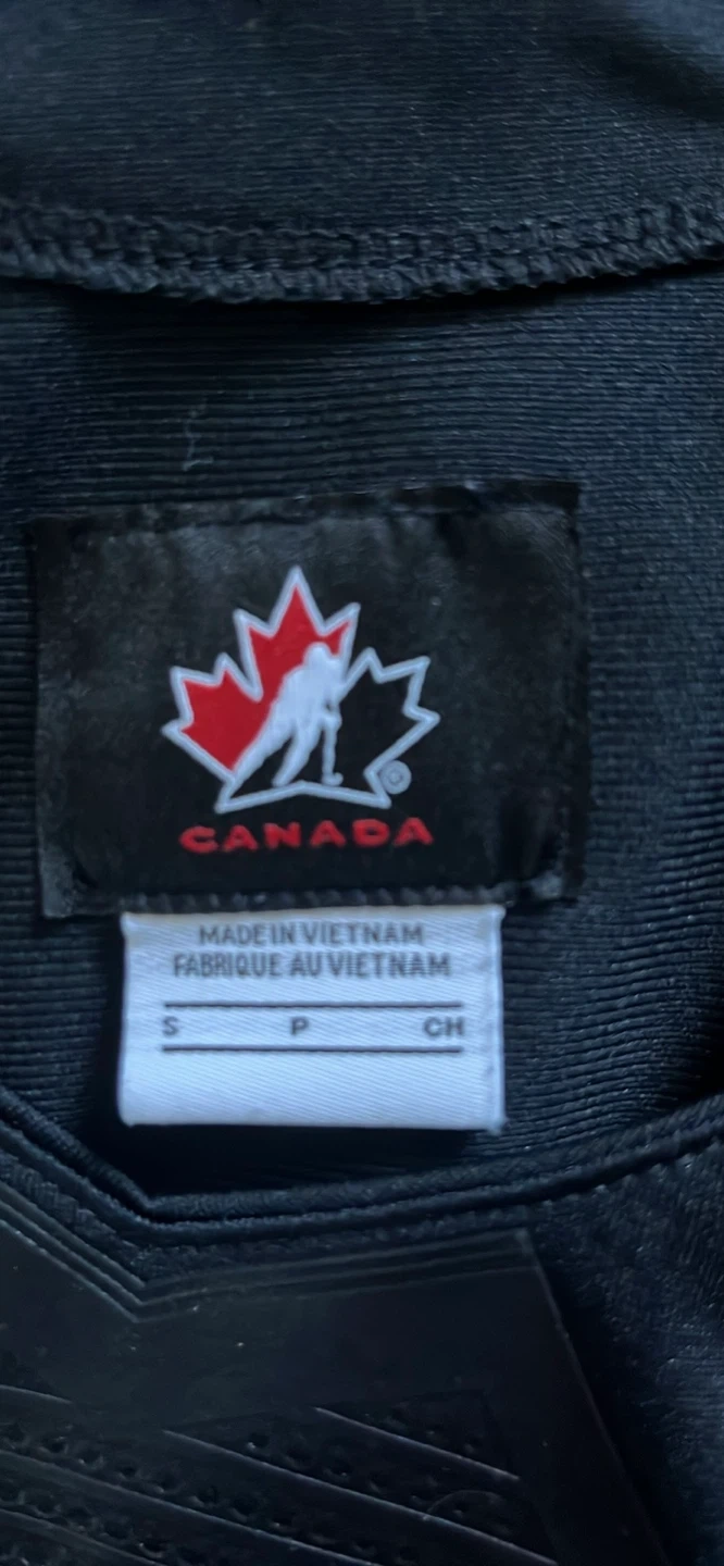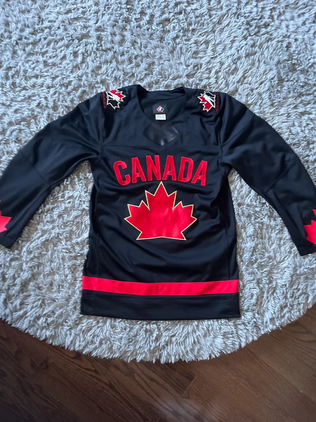 Black hockey jersey featuring "CANADA" in red with a large red maple leaf. It has red maple leaf accents on the shoulders and sleeves. This jersey has a ribbed collar and cuffs.
