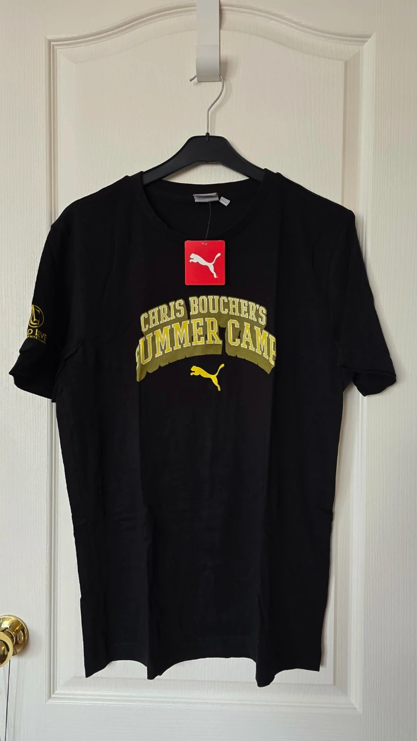 NEW Black Puma t-shirt featuring 'Chris Boucher's Summer Camp' graphic. Includes 'Puma Basketball' logo and a panther graphic on the back. Size medium.