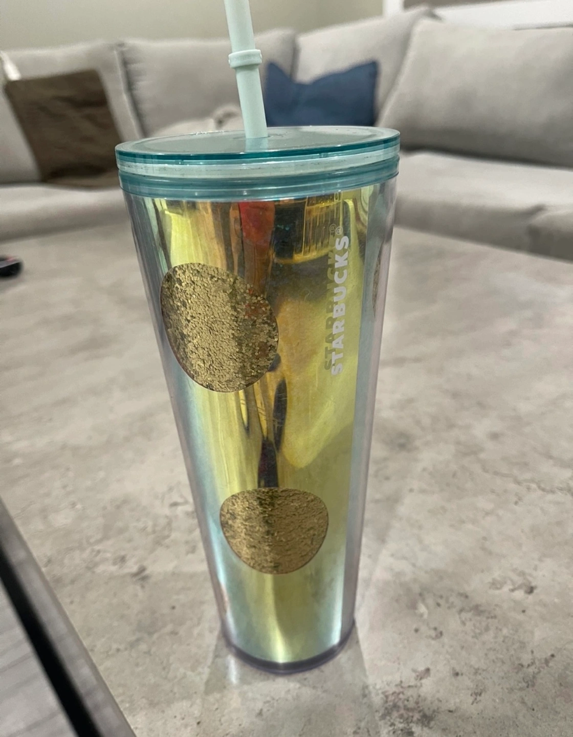 This is a Starbucks iridescent tumbler with a straw. It has gold circle accents and a shimmering, colour-changing finish. It's a reusable cup that's great for on-the-go drinks.