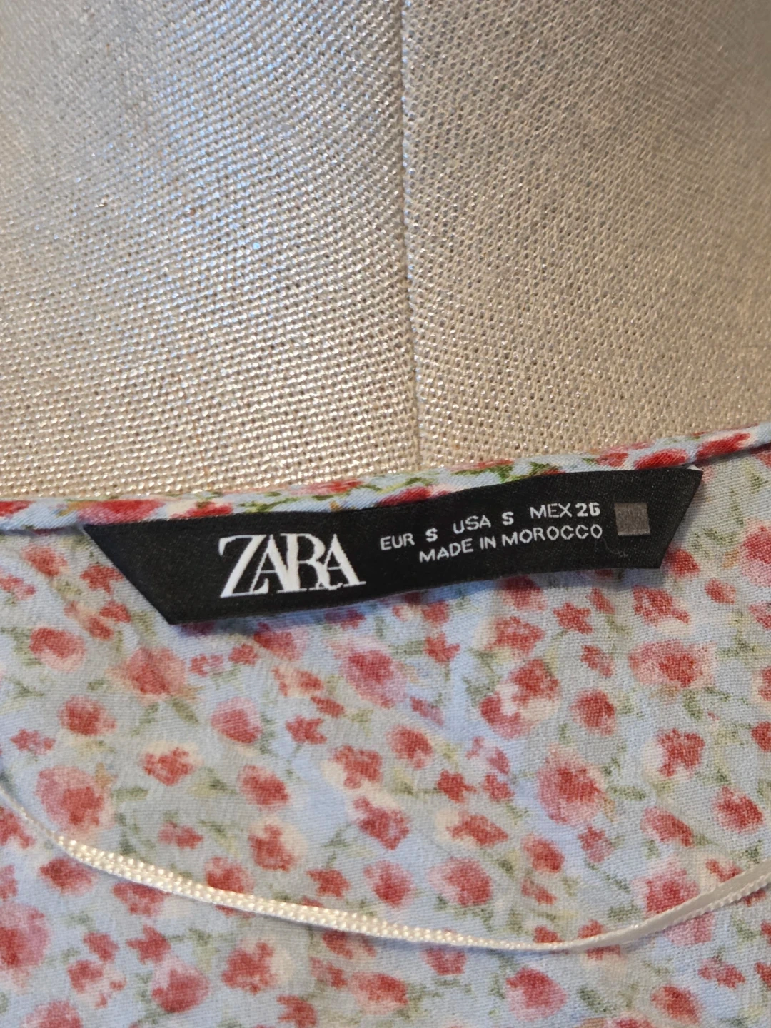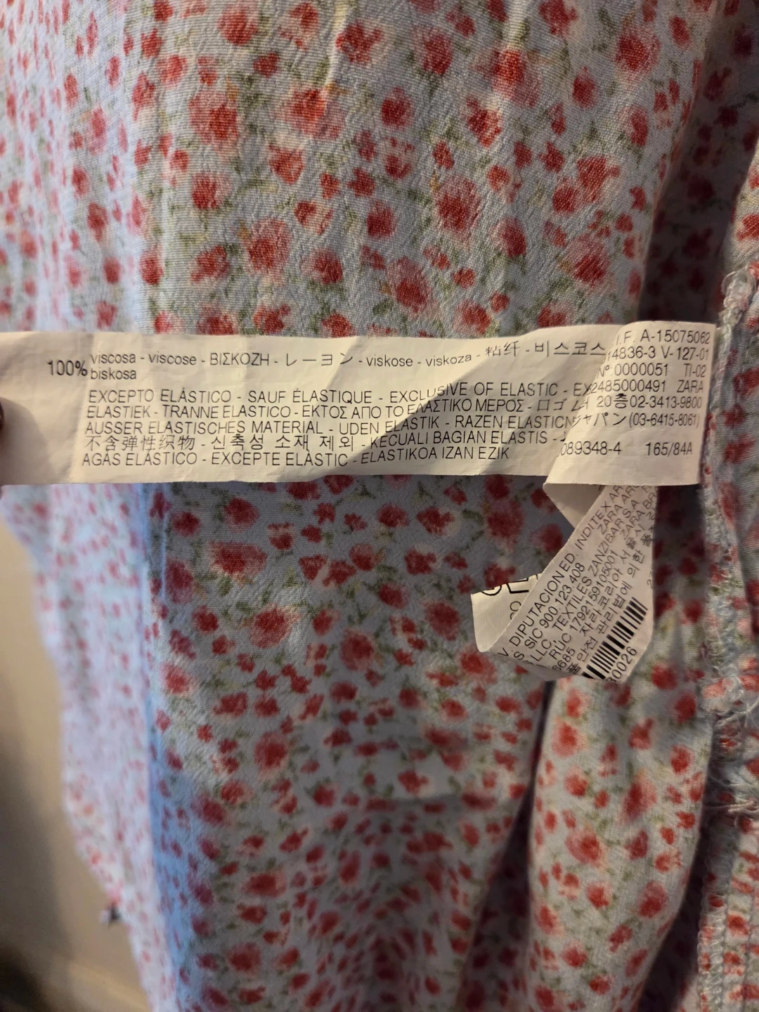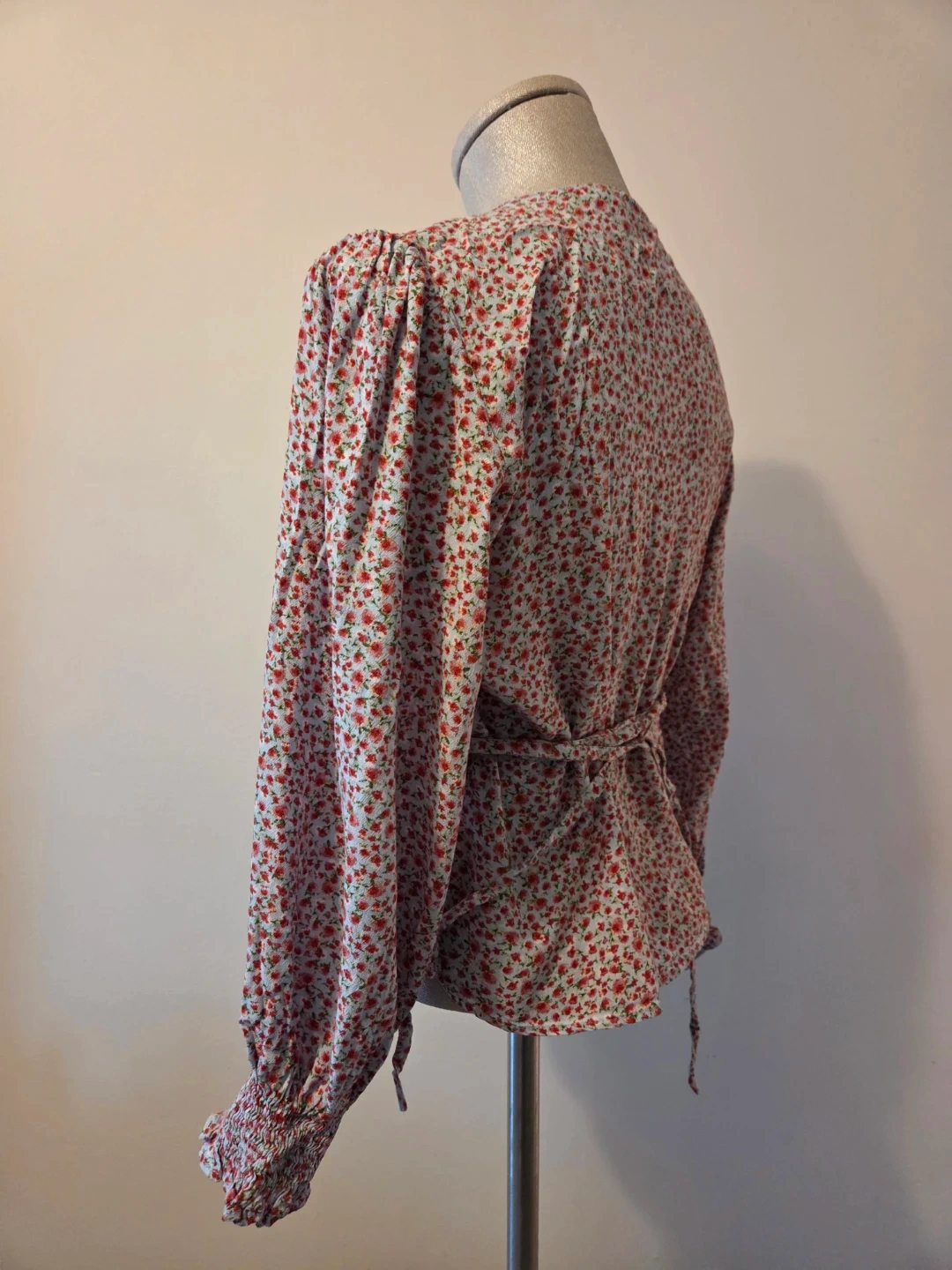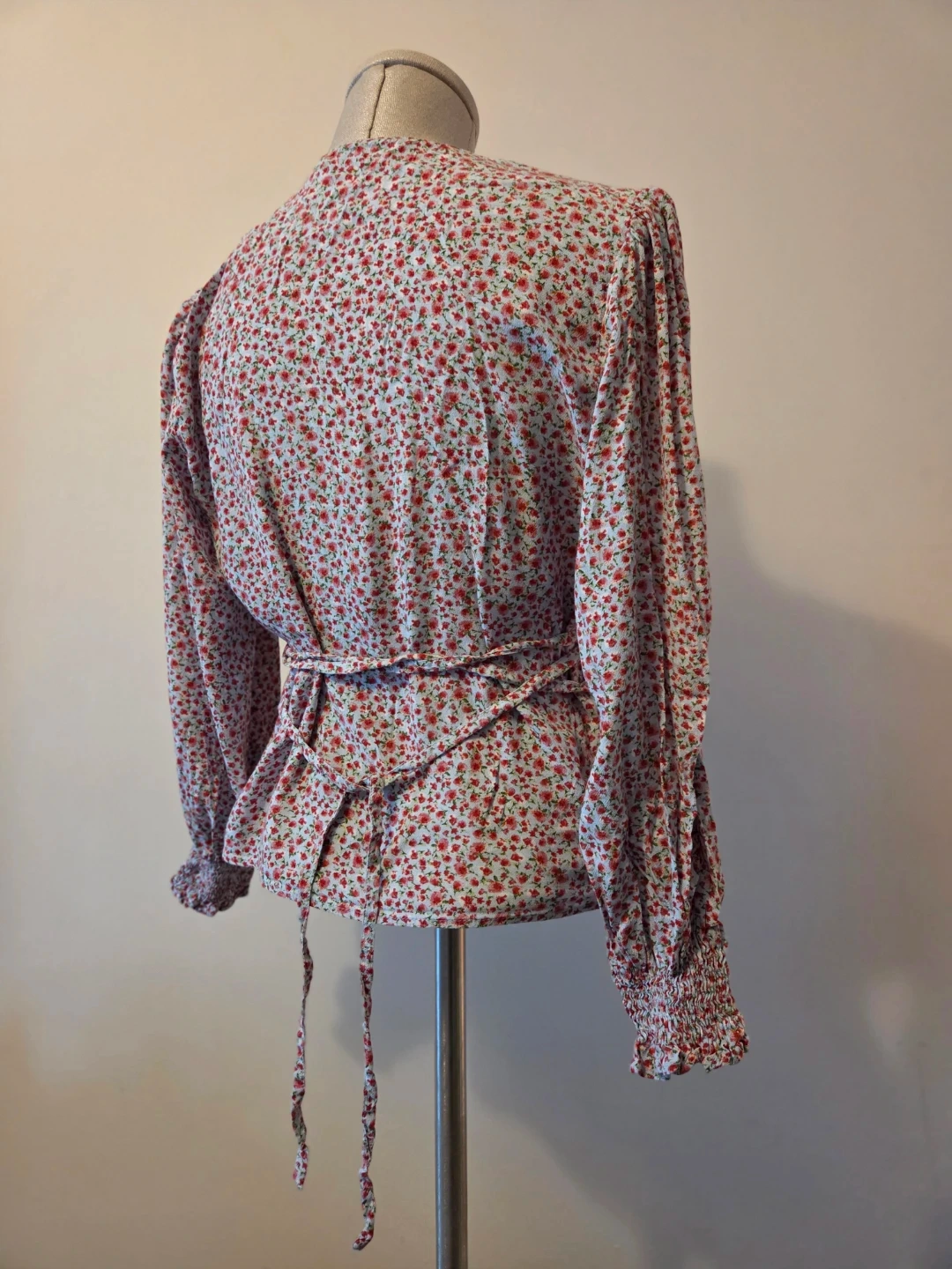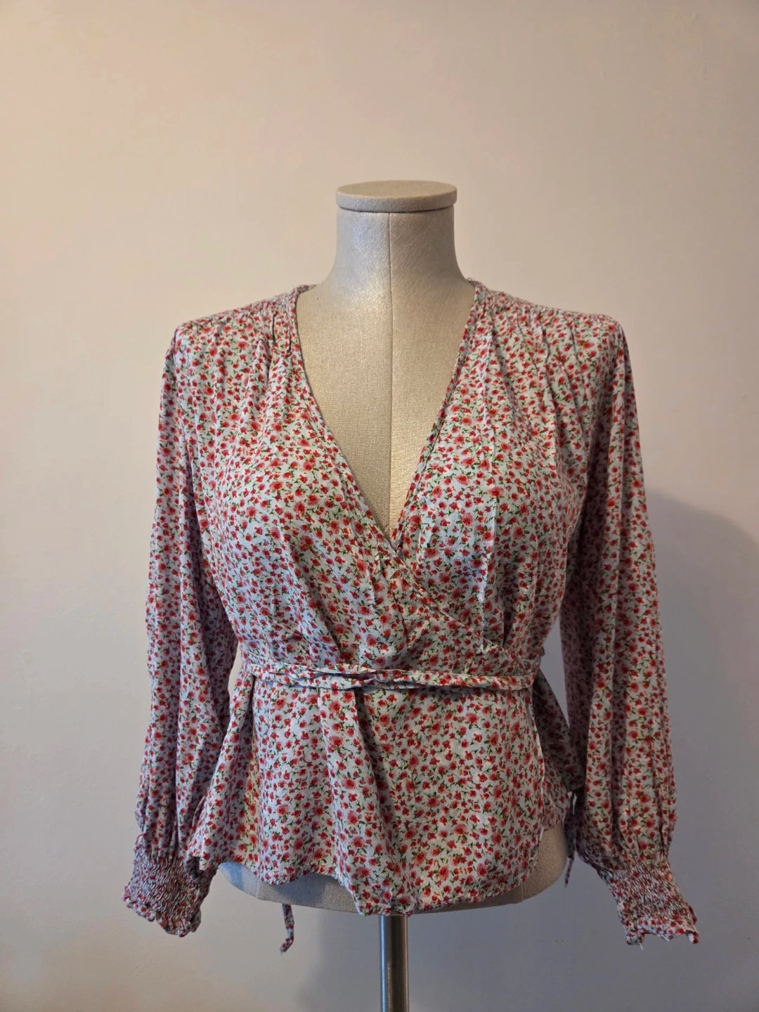 This is a ZARA floral wrap top in size S. It's 100% viscose and features a tie waist and smocked cuffs. The pretty print makes it a nice addition for spring and summer wear.