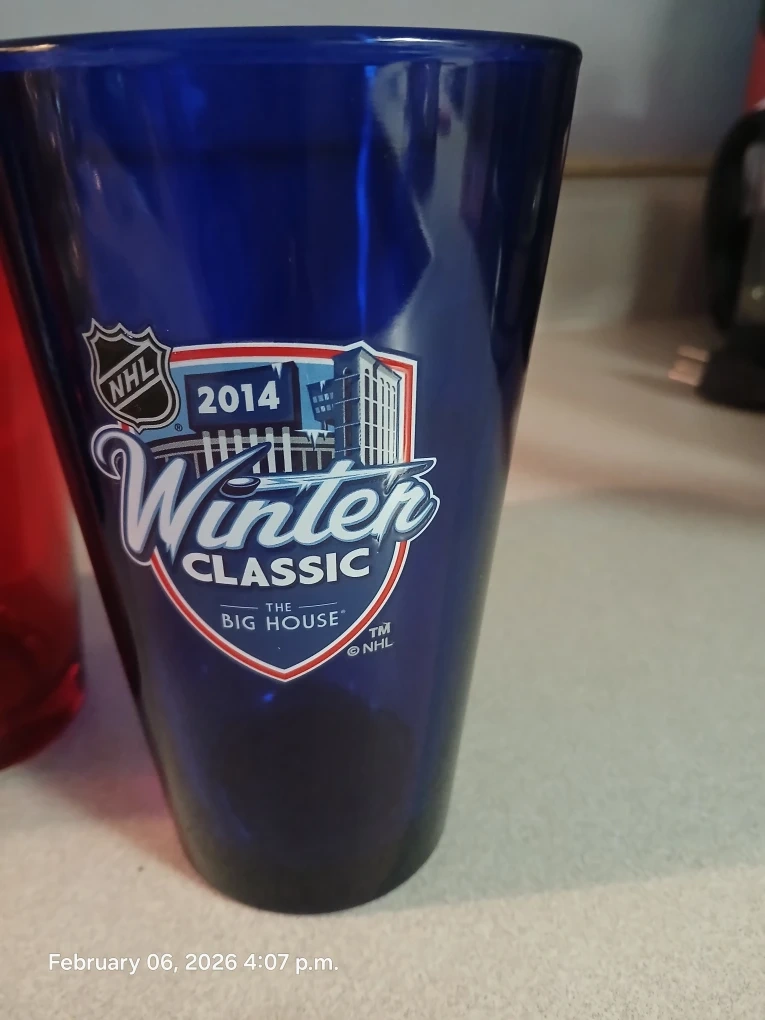 This set includes four collectible cups from the 2014 NHL Winter Classic held at The Big House. Two cups are red and two are blue, featuring the official event logo. Great for any hockey fan!