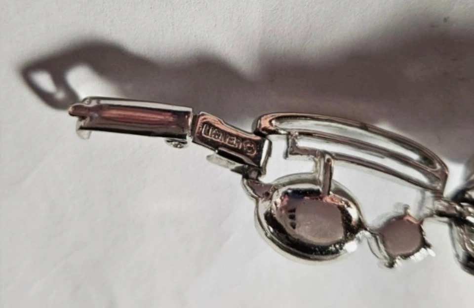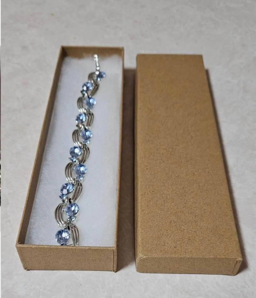 This LISNER silver bracelet features oval aqua blue stones as the main focal point, giving it a elegant and sophisticated look. Lisner stopped production in the mid-1980's. The beautiful blue color of the aquamarine stones adds a touch of luxury and glamour to any outfit, making it a versatile accessory for any occasion. With a length of 7 inches, this bracelet is the perfect size to add a statement to your wrist. This bracelet was given to my mother in the early 1980's. It hasn't been worn since then. It was kept in her jewelry box.
