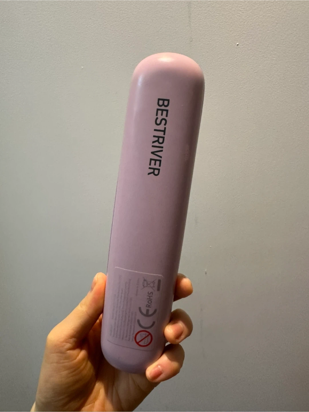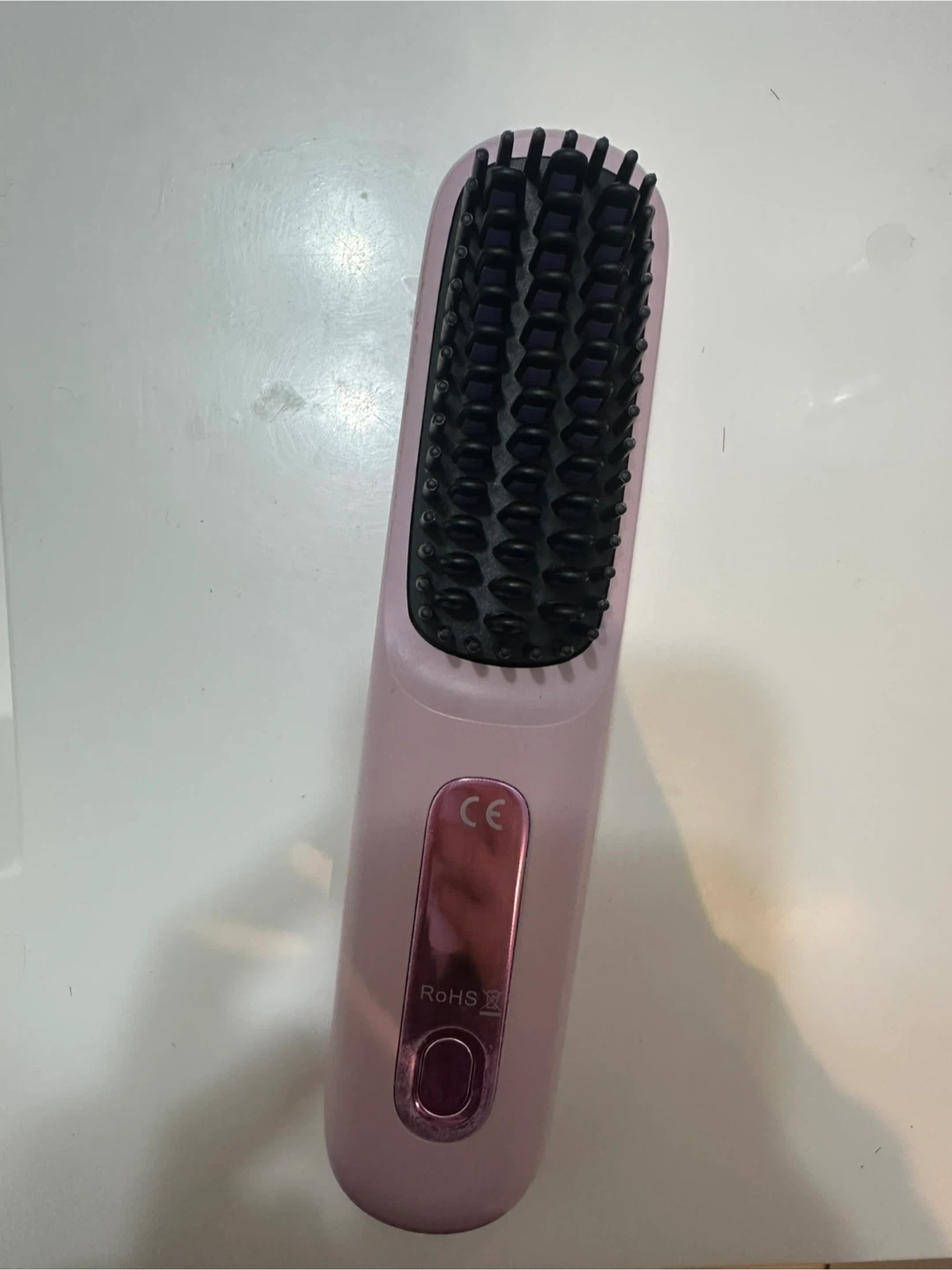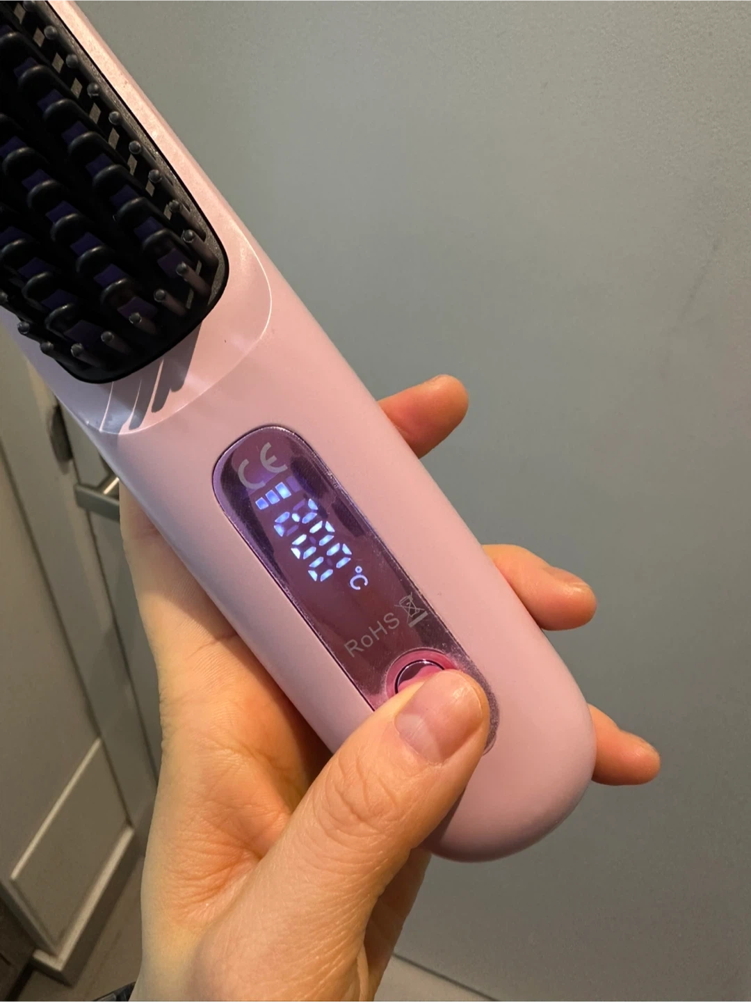 This is a BESTRIVER brand heated hair straightening brush in a light pink colour. It displays temperature settings of 160, 180 and max 200 degrees Celsius. It's designed for quick and easy hair styling.