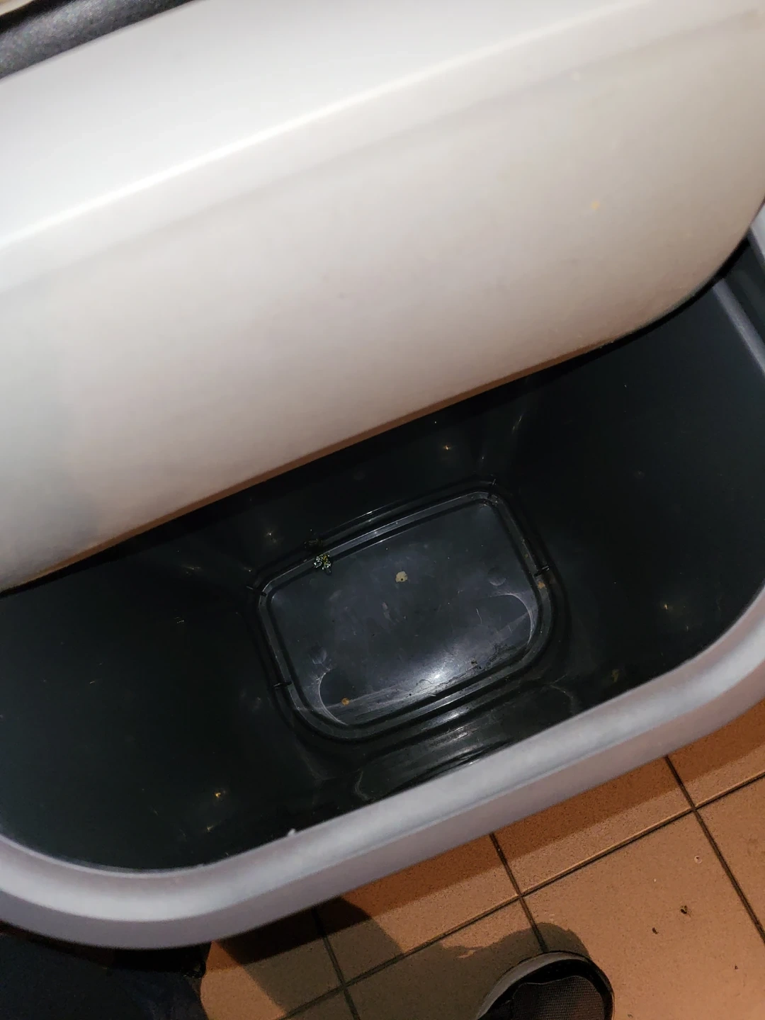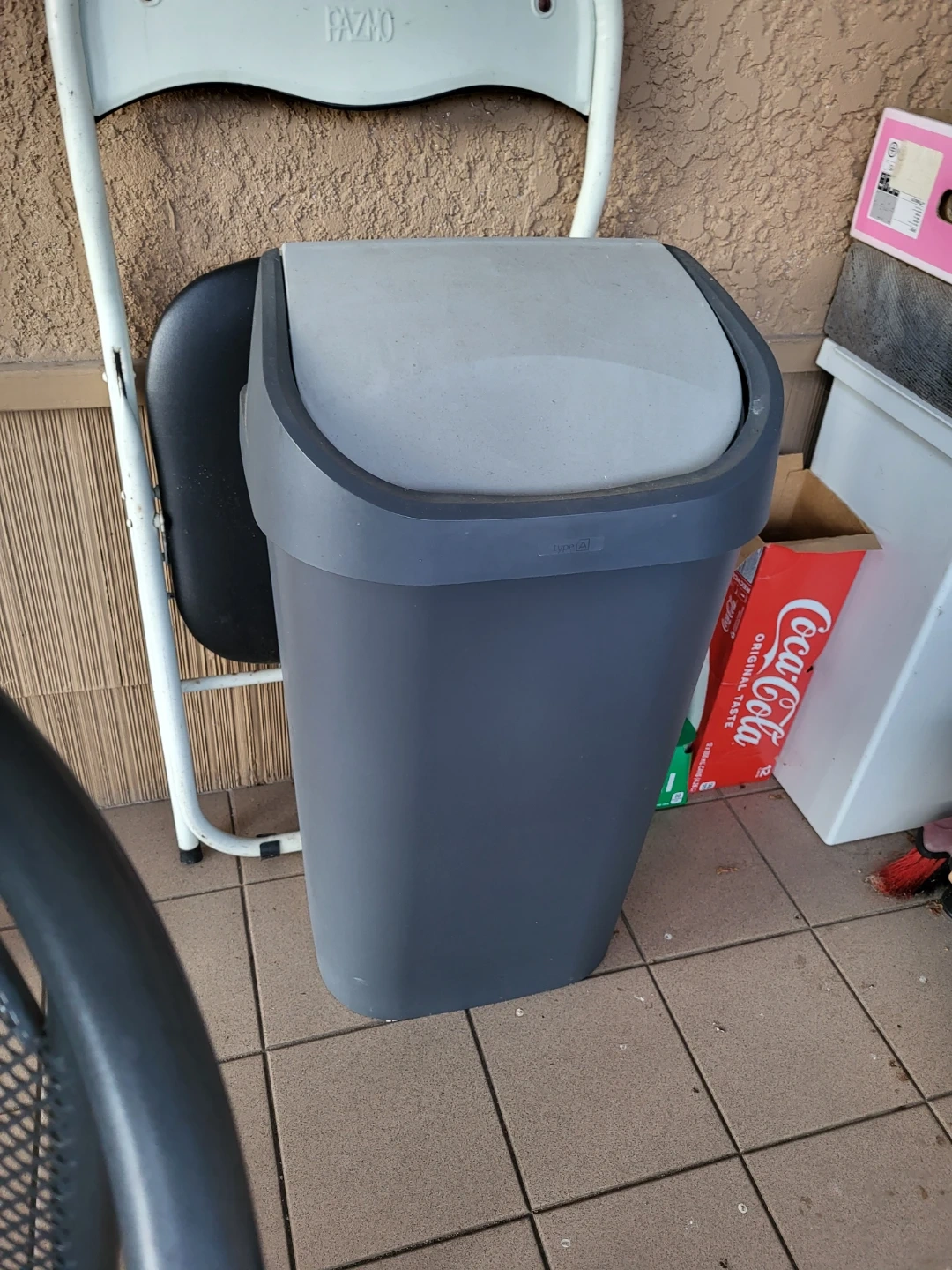 This is a simple grey step trash can with a flip-top lid. It's made of durable plastic and is a good size for kitchens or bathrooms. Useful for keeping your space tidy!
