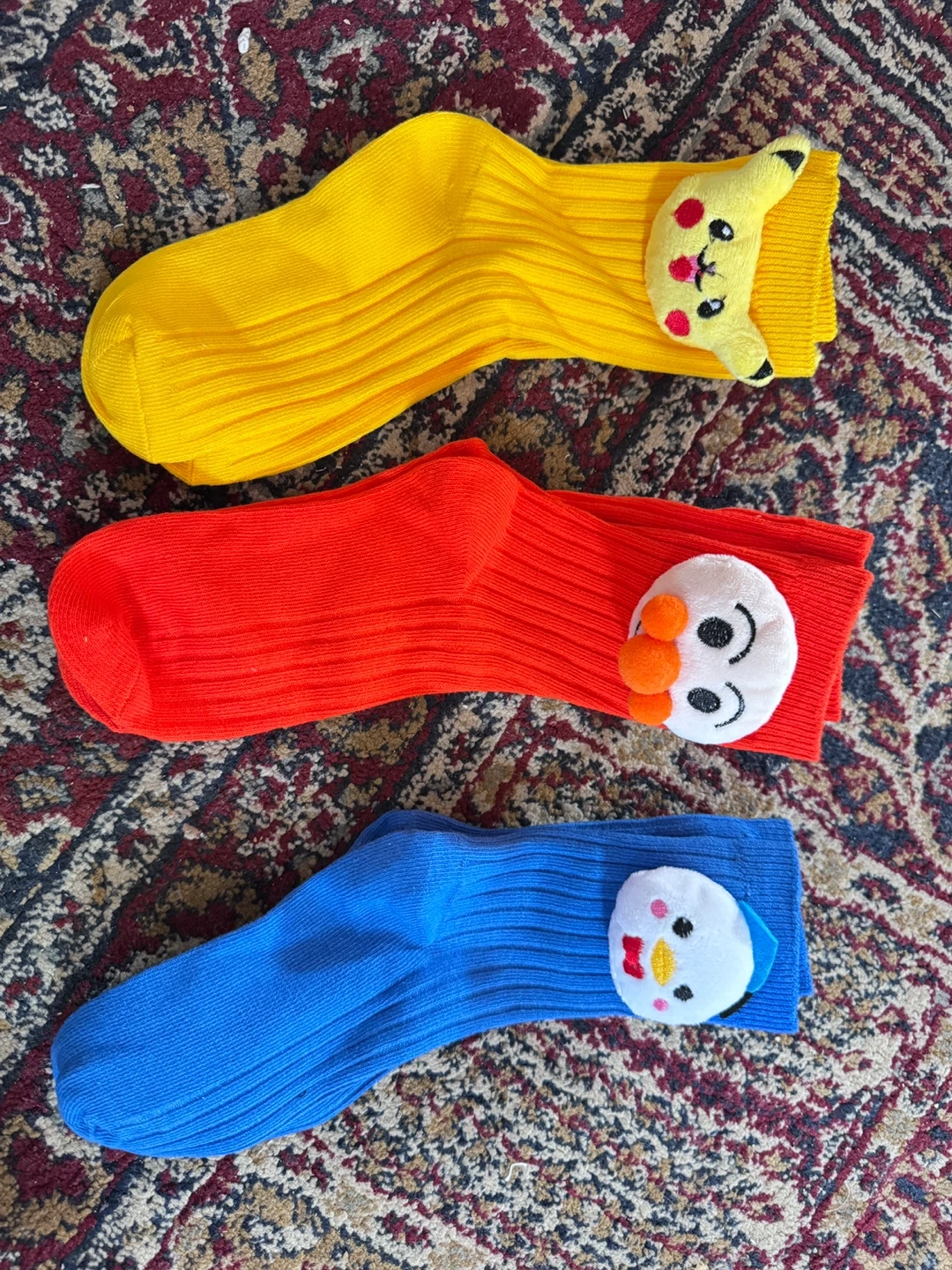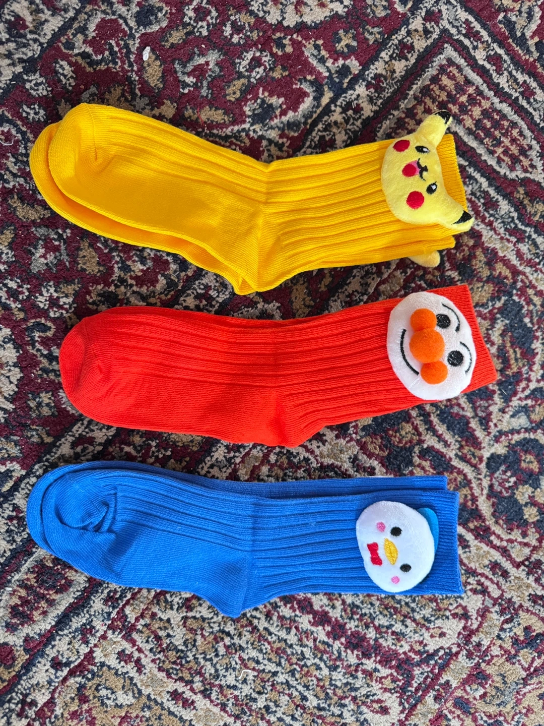 This set includes three pairs of cozy children's socks in fun colours. One pair features a yellow design with a Pikachu character. Another pair is red with a snowman design. The third pair is blue with a white bird character. They're great for keeping little feet warm!