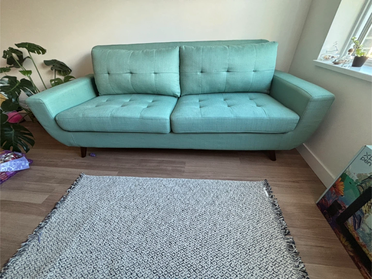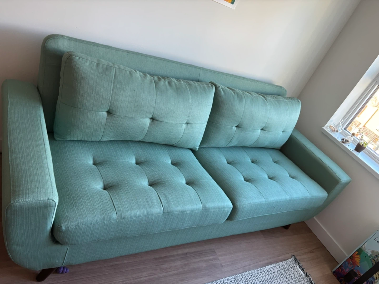 The fabric on the bottom is missing as pictured in the second to last photo. Legs are detachable and come with the sofa in a separate bag (to make it easier to take down my building’s elevator).