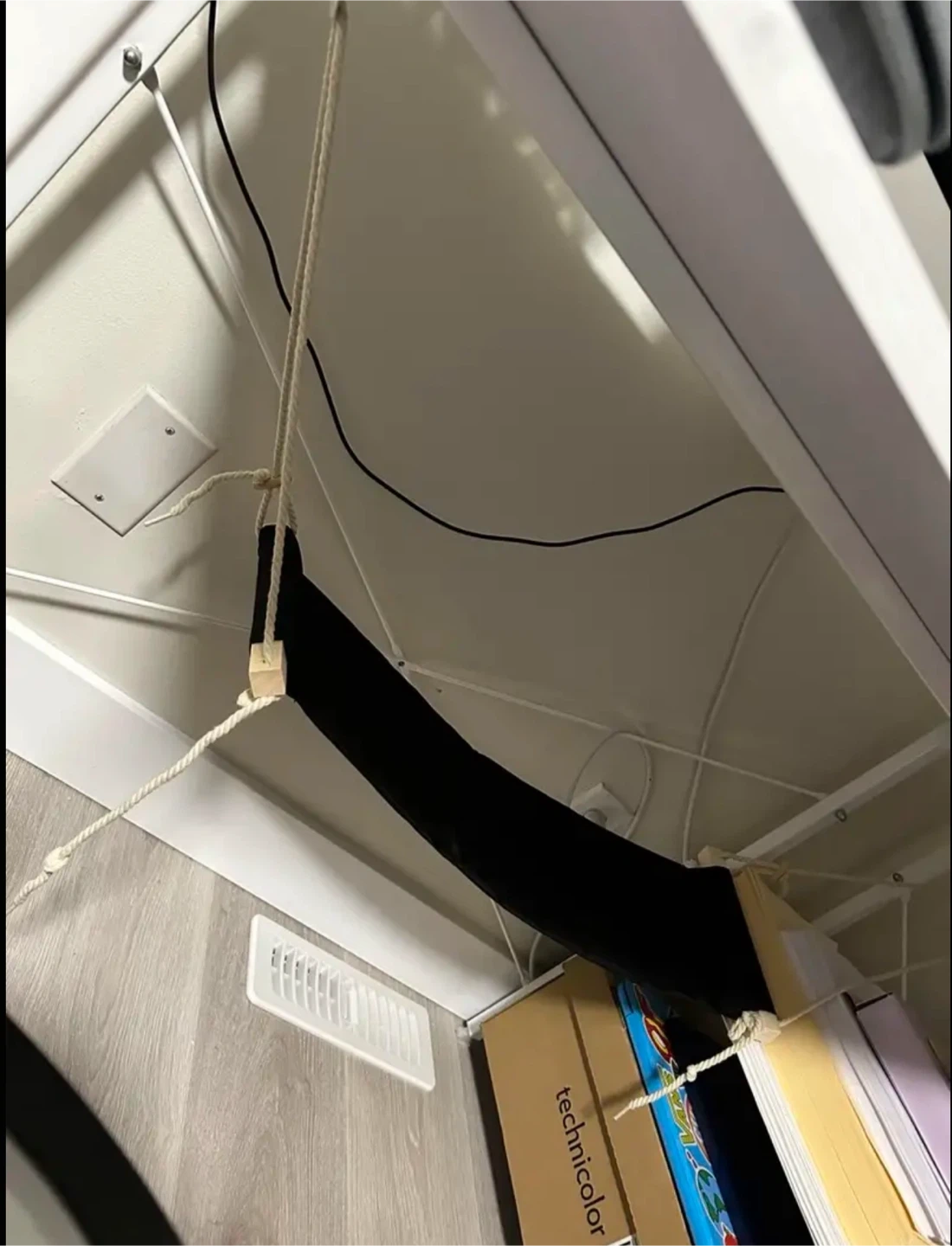A black under desk hammock with ropes and metal clips. It's designed to attach to the underside of a desk. Great for relaxing your feet during work!