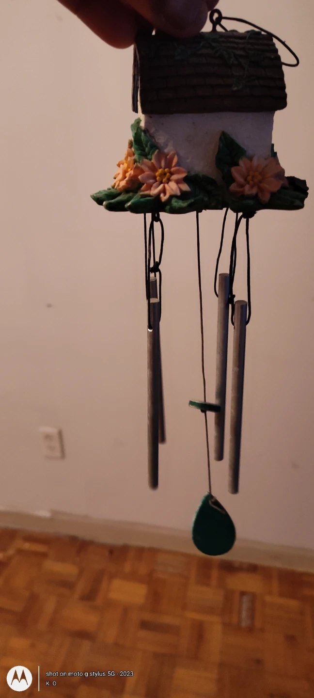 This used and good condition decorative wind chime features a charming birdhouse-style top adorned with pink flowers.