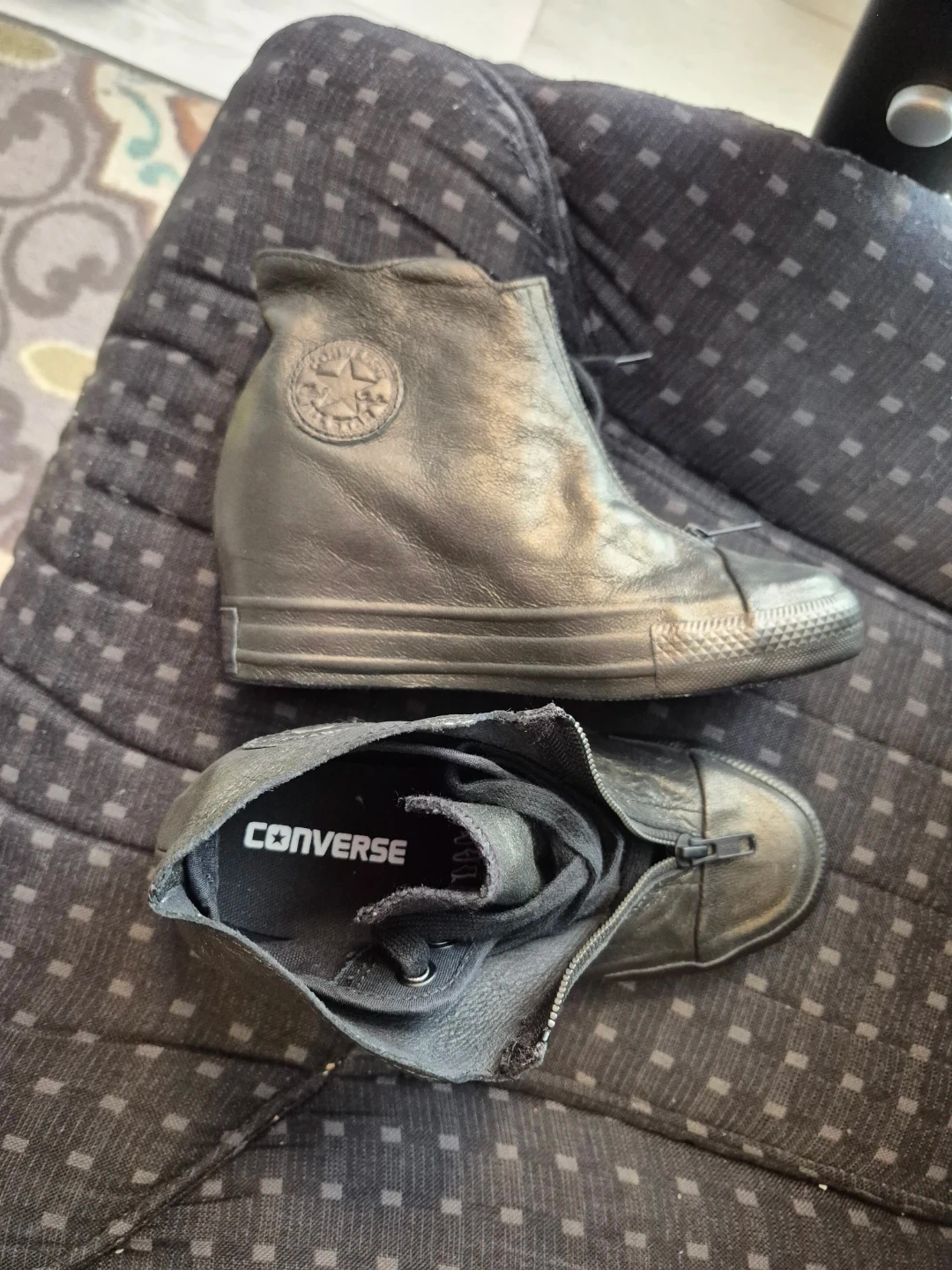 Black leather Converse wedge high-top sneakers with a side zipper. Features the classic Converse star logo on the side. This style combines the look of a sneaker with the added height of a wedge.
