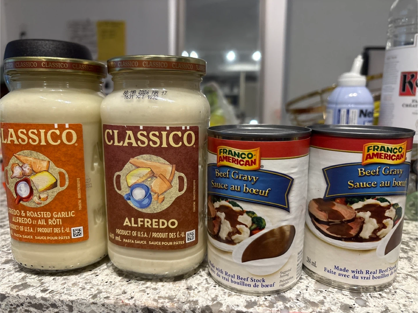 Two jars of Classico Alfredo pasta sauce, one Alfredo & Roasted Garlic and one plain Alfredo. Two cans of Franco-American Beef Gravy, each 284 mL. Sauces are 410 mL.