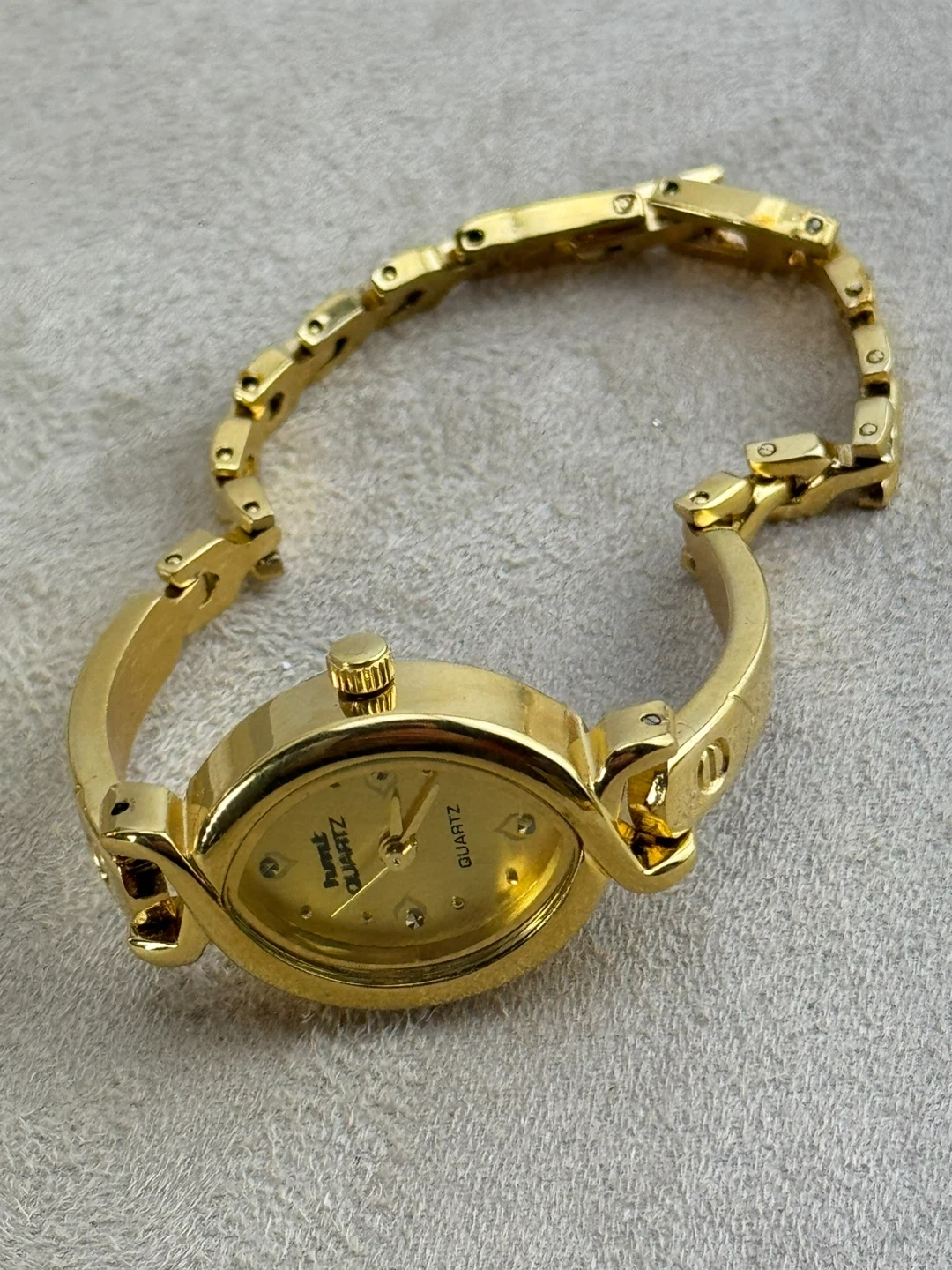 This is a classic gold-tone bracelet watch by Hart. It features a quartz movement for reliable timekeeping. The oval face is adorned with small crystal markers. This watch adds a touch of elegance to any outfit!
