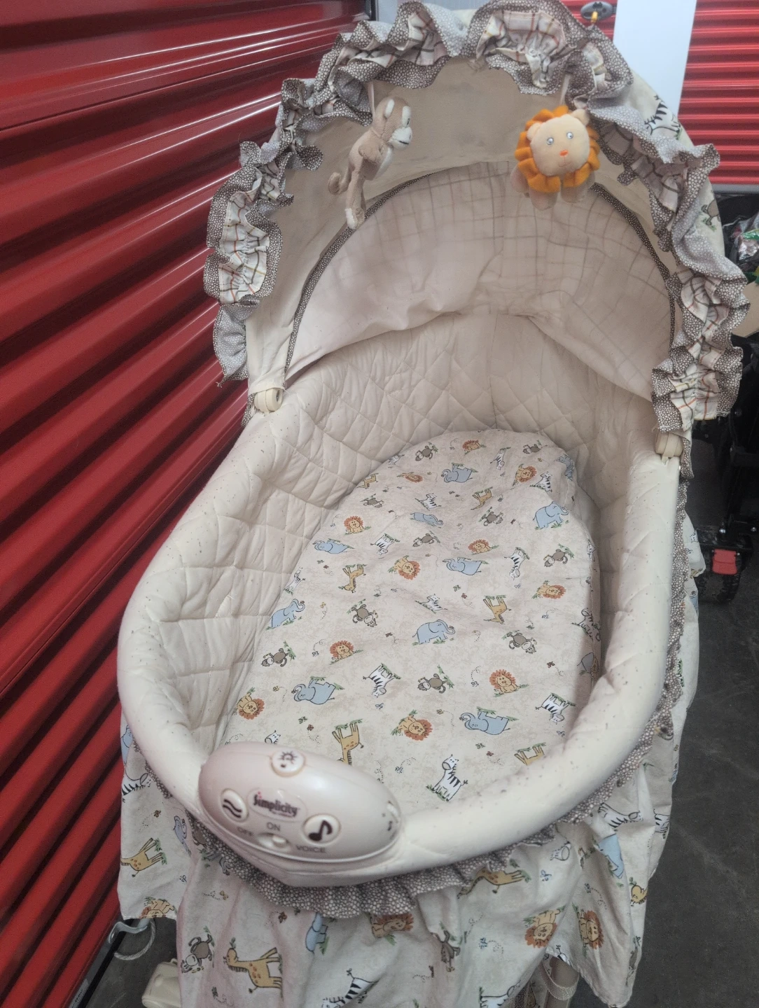 Infant bassinet in a cream colour with a cute animal print. It features a comfortable quilted mattress and a canopy with hanging toys. It also has a music and sound unit attached. This bassinet is perfect for keeping your newborn close by.