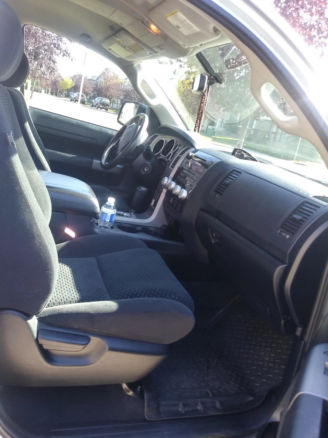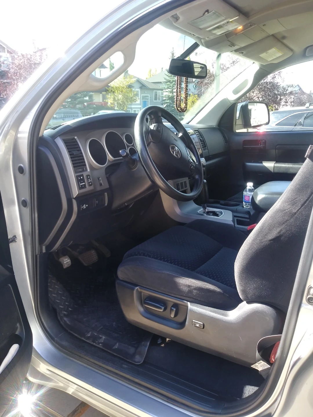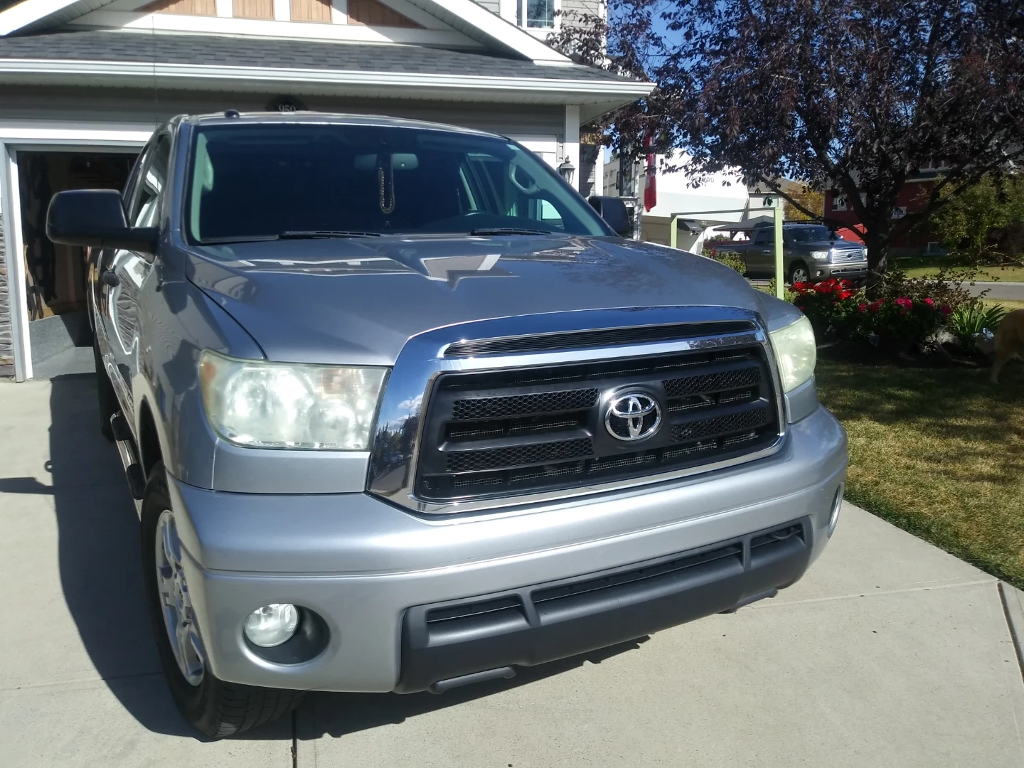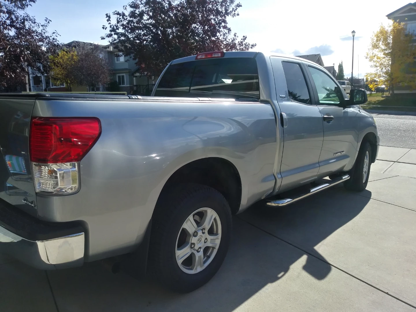 Silver Toyota Tundra pickup truck. Four-door crew cab model. Features include running boards and a tonneau cover. Interior shows cloth seats and floor mats. 2011 4×4 SR5 with 176000 kms extremely clean none smoker and no accidents