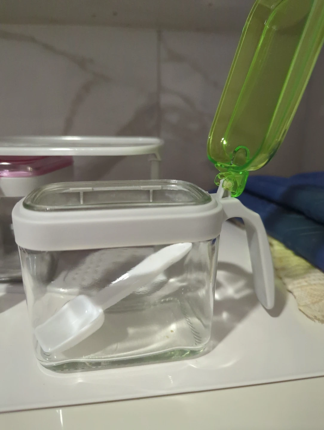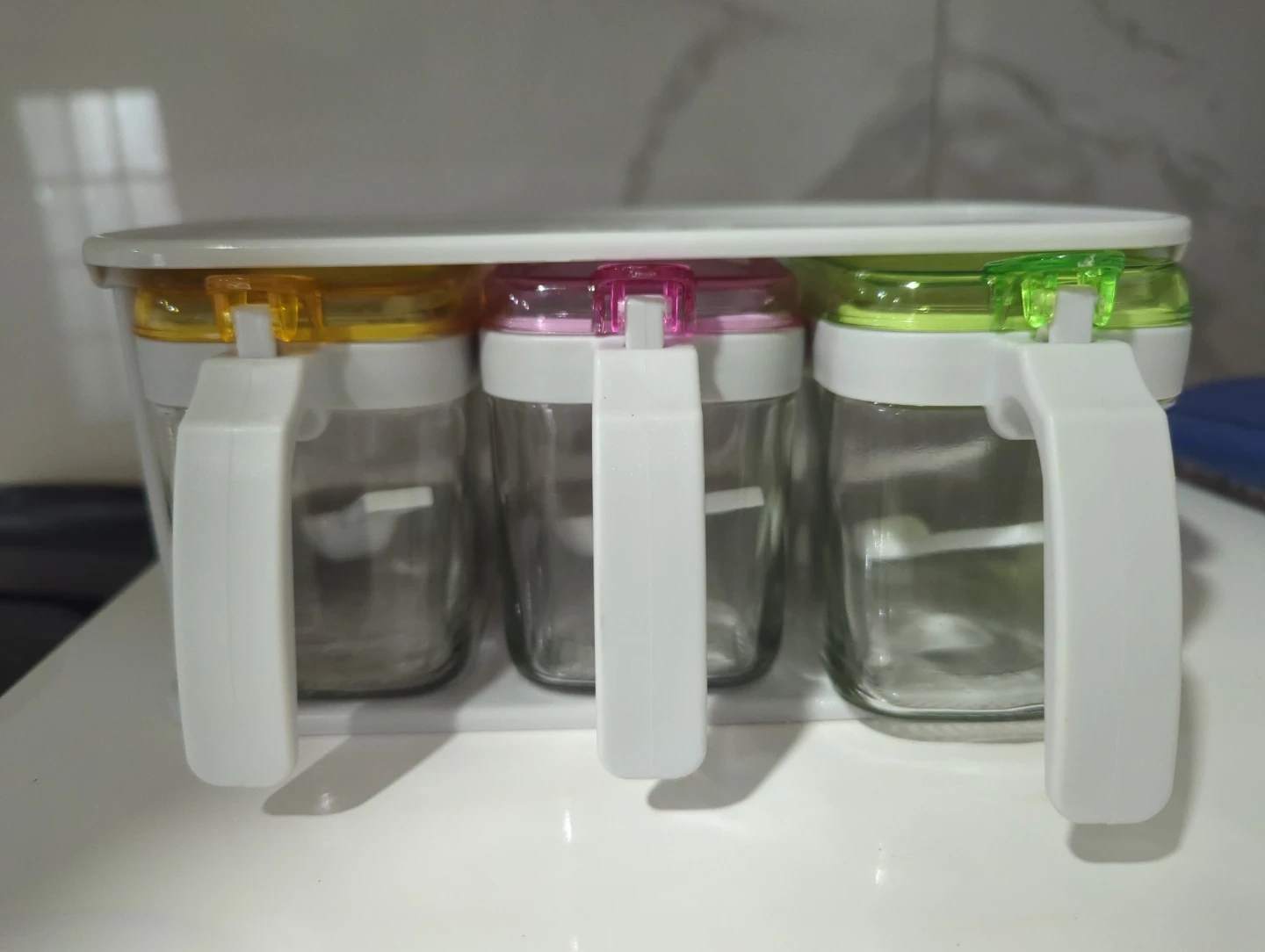 This set includes three clear glass spice jars with white handles and colourful lids. Each jar comes with a spoon. They're perfect for organizing your kitchen spices or condiments!