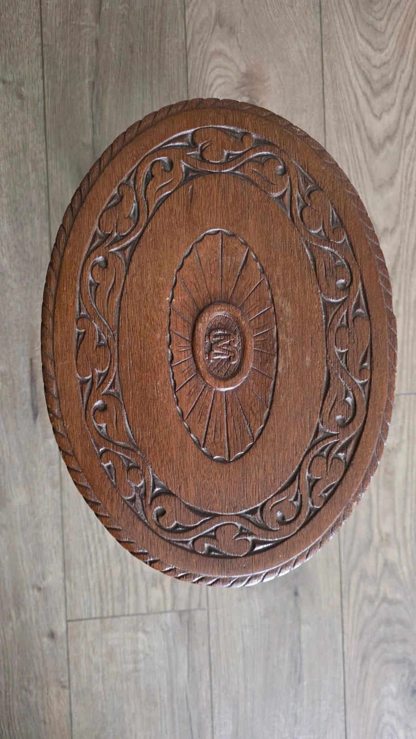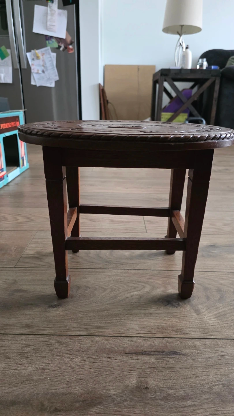 This is a vintage carved wood side table/stool with intricate detailing on the top. It has a sturdy wooden frame and is perfect for placing beside a chair or sofa. Dimensions: approximately 12 inches tall with a 14-inch diameter top.