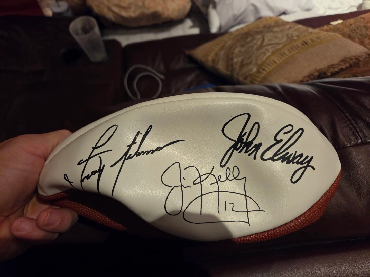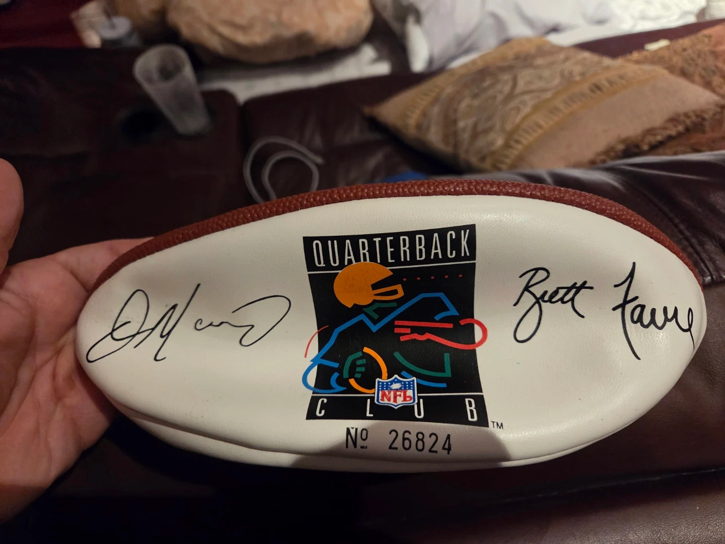 Wilson NFL football, featuring the Quarterback Club logo and multiple signatures. It's made in the U.S.A. and has Ultra-Grip synthetic leather. This ball would be a great addition for any football memorabilia collector! No.