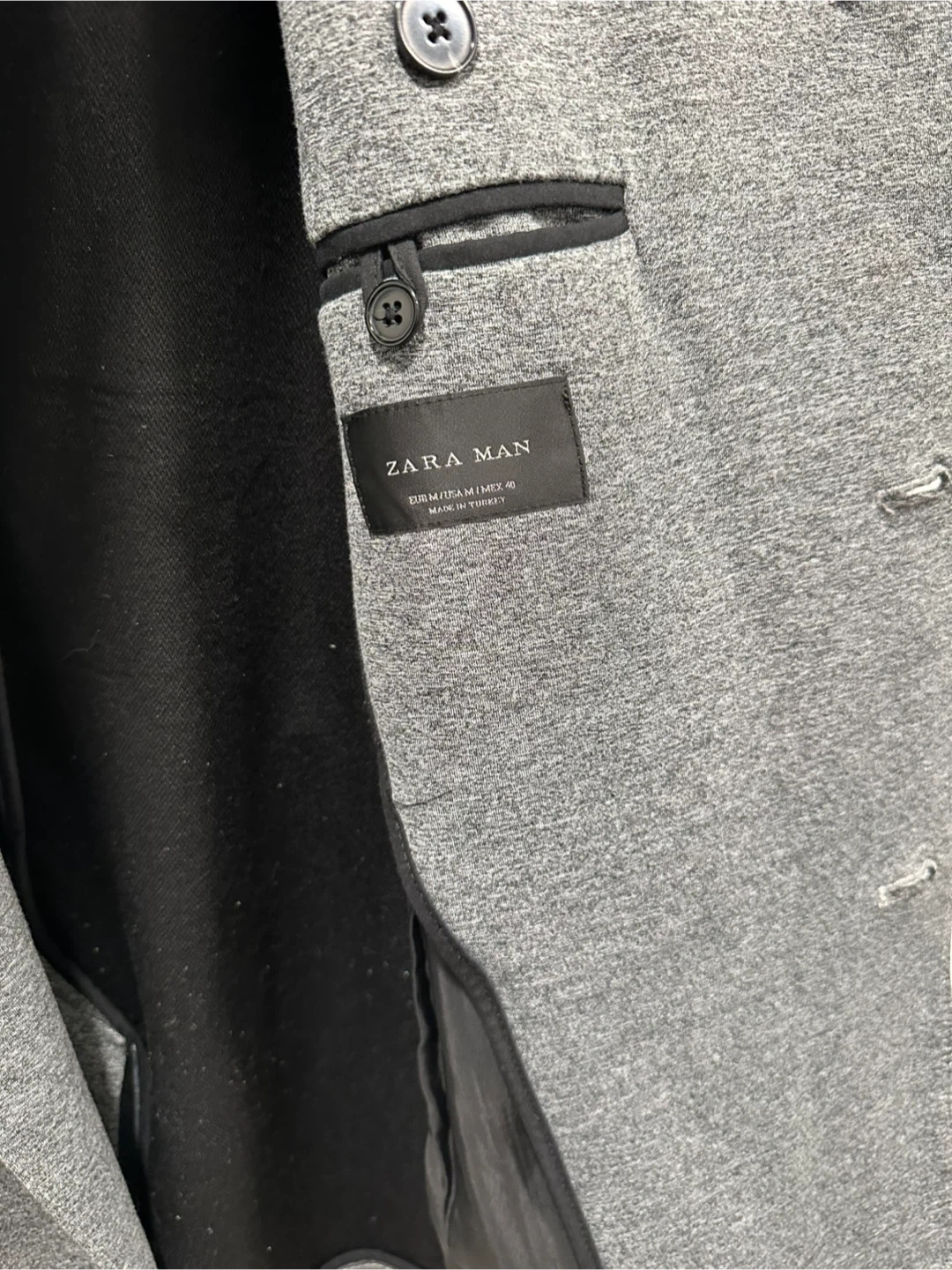 This Zara Man trench coat is grey and double-breasted. It's made of a soft, jersey-like material and comes with a matching belt. The coat features epaulets and buttoned cuffs. Size M