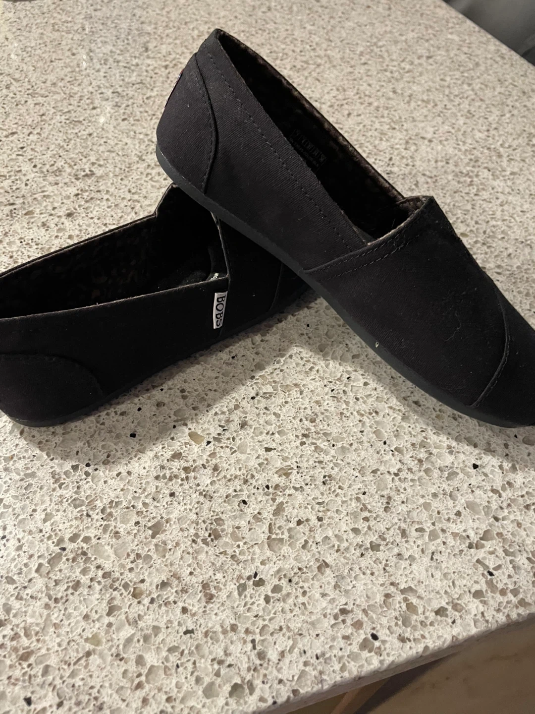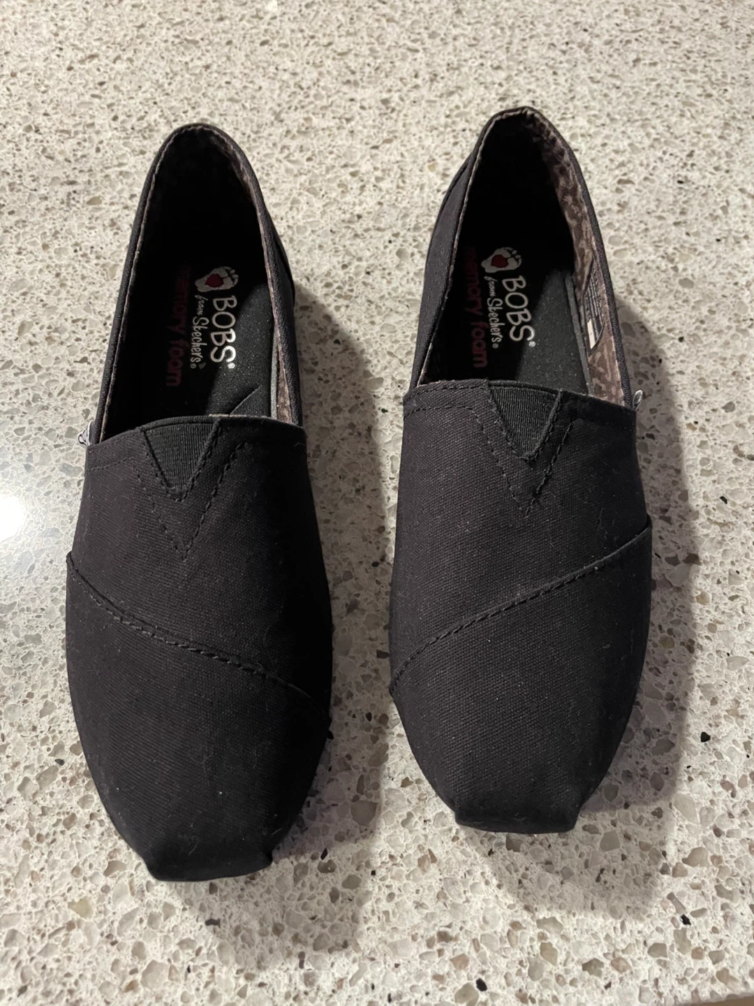 These BOBS by Skechers flats feature a black canvas upper with memory foam insoles for comfort. They have a slip-on style with elastic gore for a snug fit. The rubber outsole provides good traction.