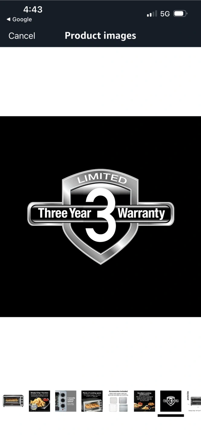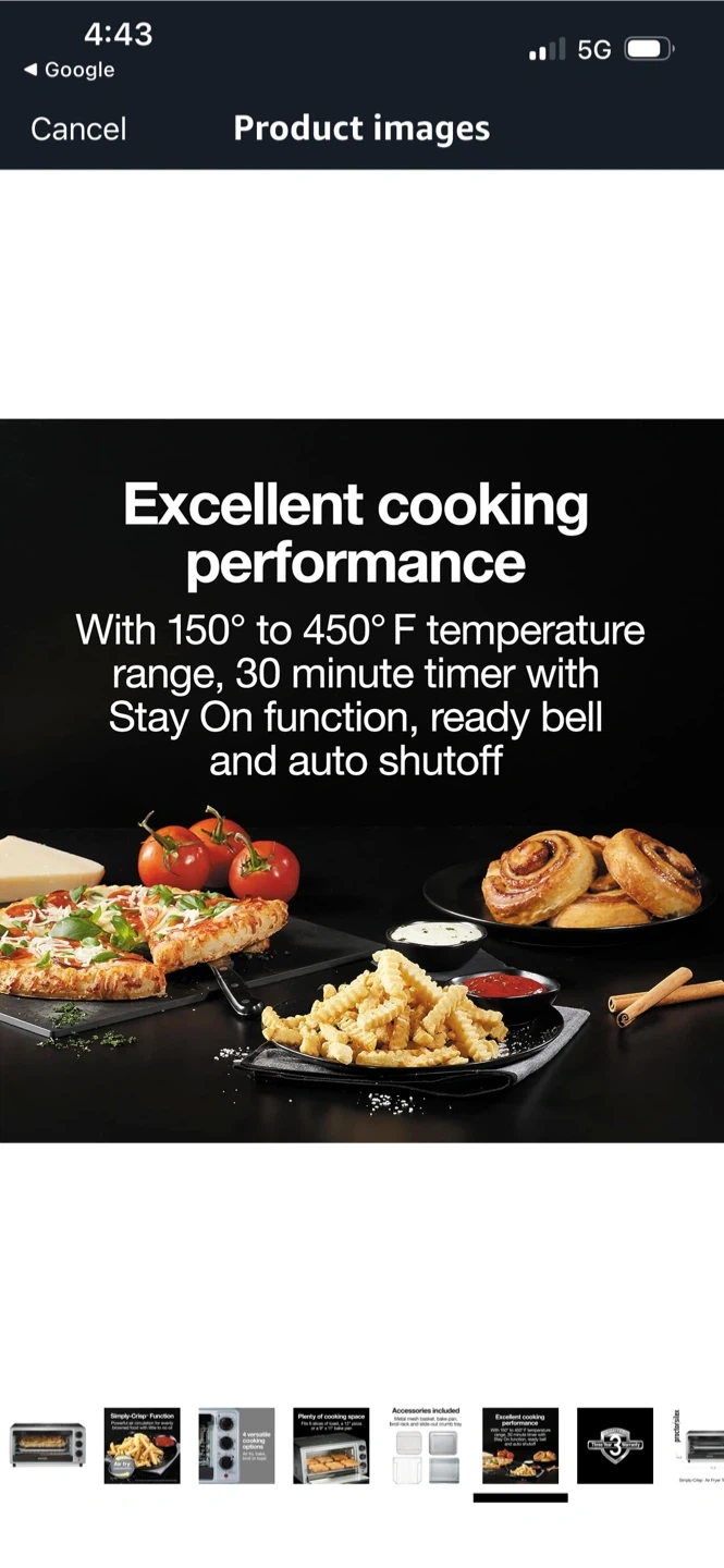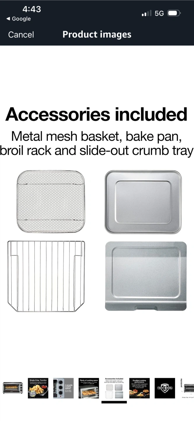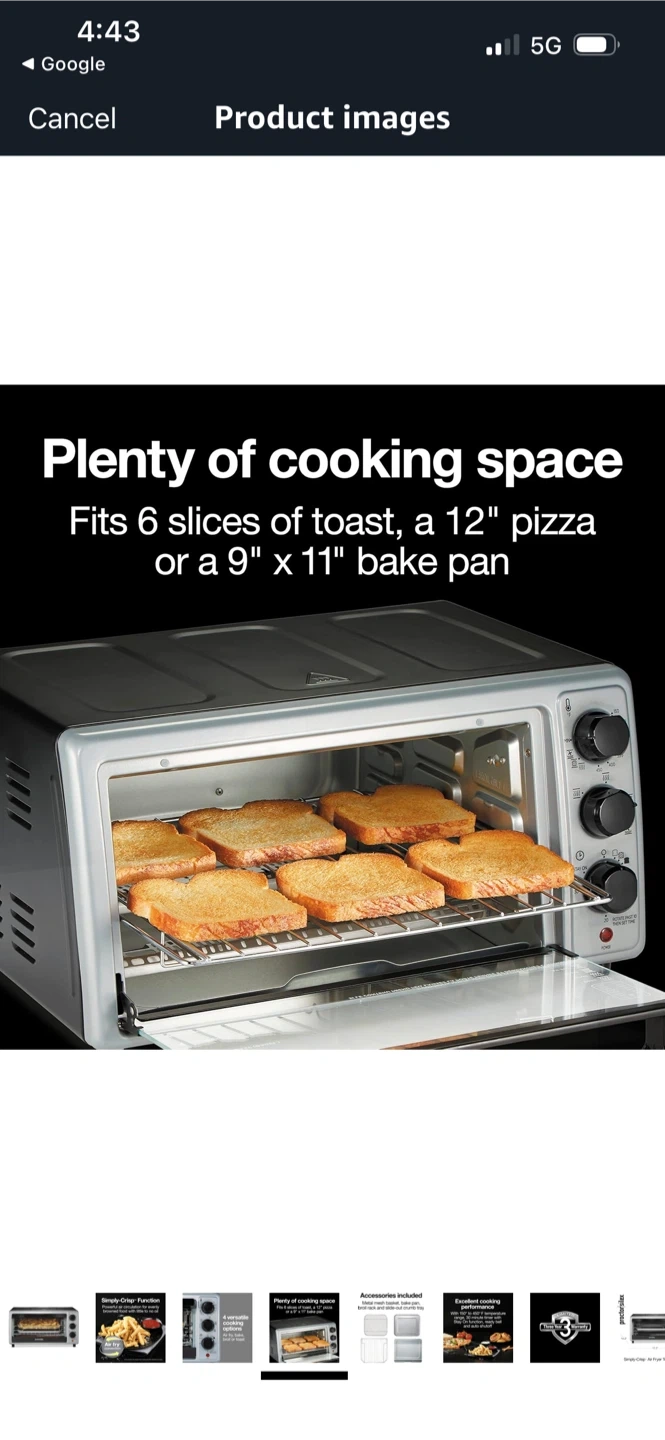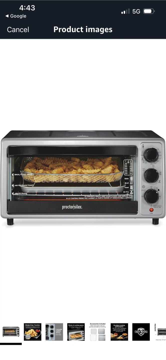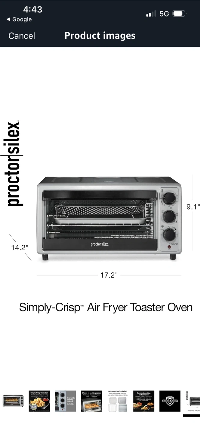 This Proctor Silex oven offers 4 versatile cooking options: air fry, bake, broil, or toast. It includes a metal mesh basket, bake pan, broil rack, and slide-out crumb tray. The Simply-Crisp function provides powerful air circulation for food with little to no oil. It fits 6 slices of toast, a 12" pizza, or a 9" x 11" bake pan.