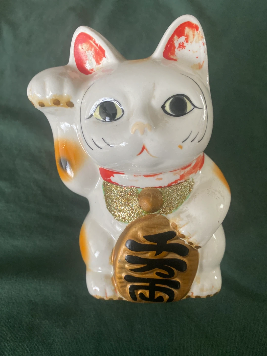 Ceramic figurine of a Maneki Neko, or lucky cat. It's white with orange and red accents and holds a golden coin with Japanese characters. This piece is commonly used to invite good fortune!