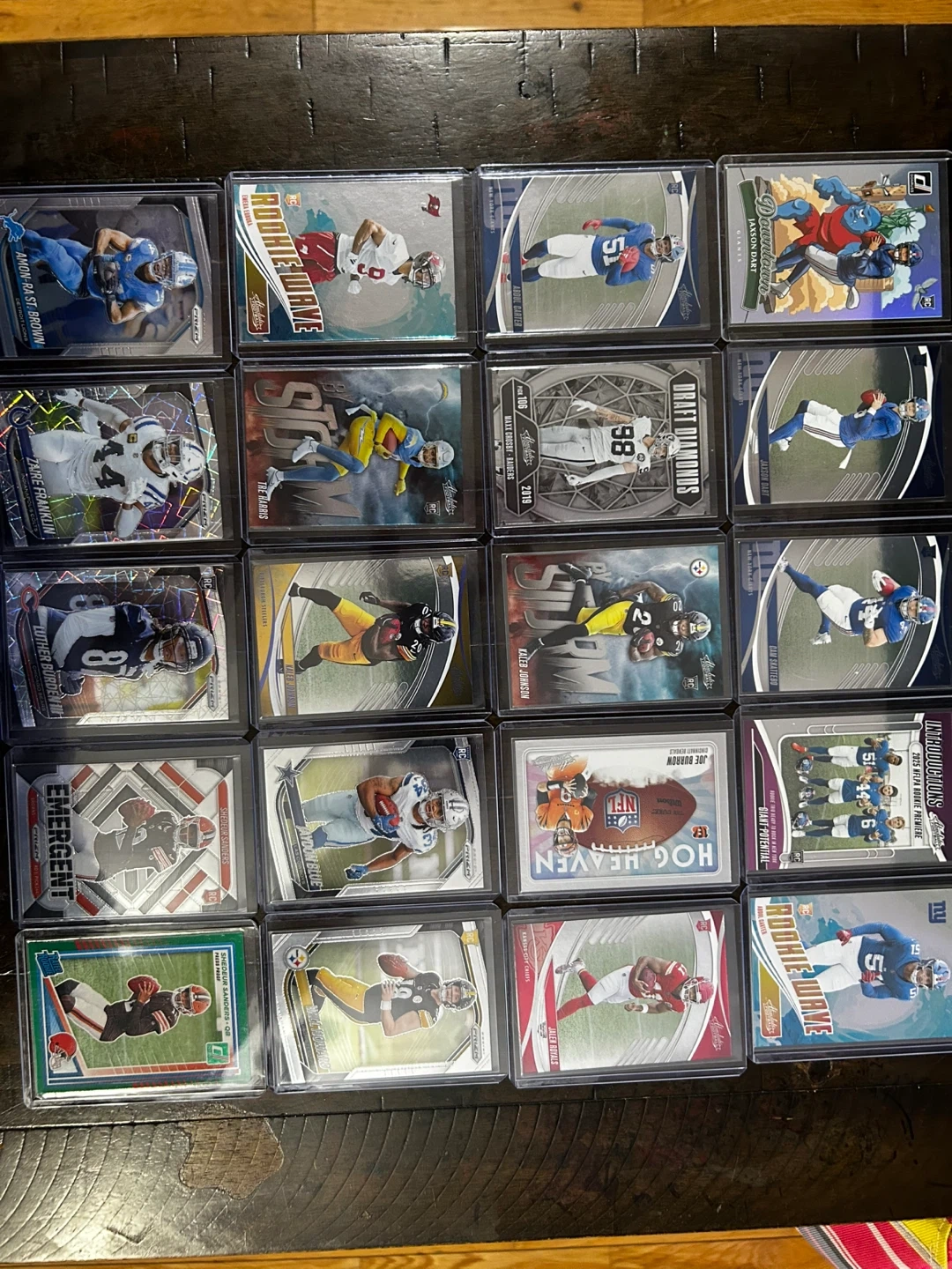 This is a collection of various NFL football trading cards. Cards include players like Amon-Ra St. Brown, Zaire Franklin, and Jaxon Dart, with some rookie cards. It's a great assortment for any football card collector!