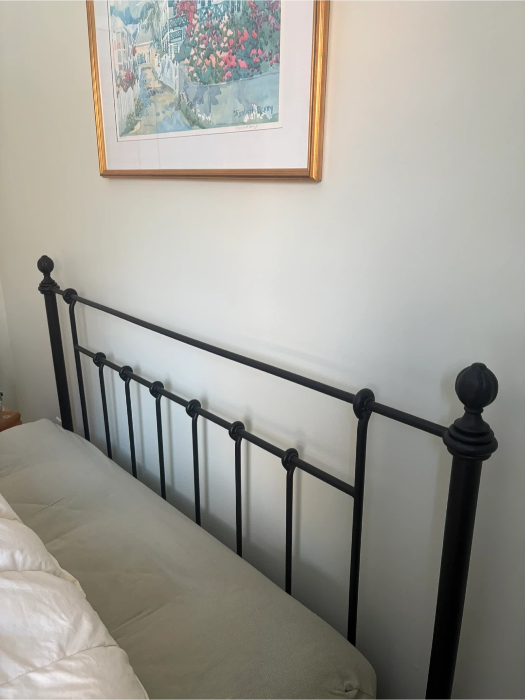 This is a classic black metal bed frame. It features a simple yet elegant design with decorative finials on the posts. The frame is made of durable metal. This bed frame is a solid choice for any bedroom.