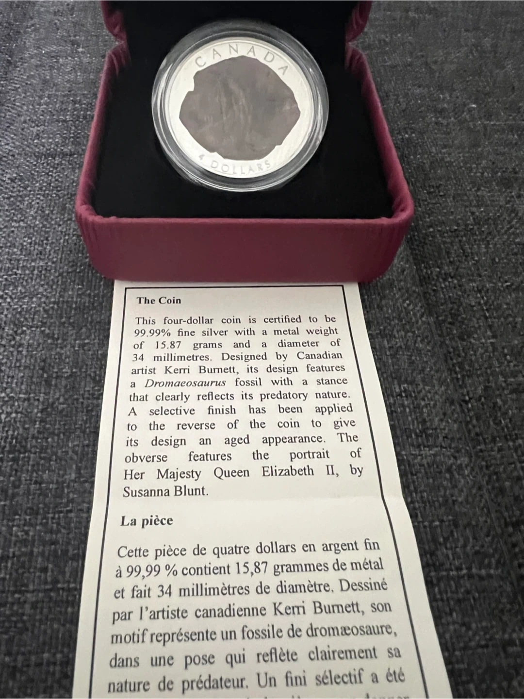 This coin is 15.87 grams, over half an ounce of 99.99% silver. 4$ face value.It features a dinosaur fossil design and comes with its original box and papers.