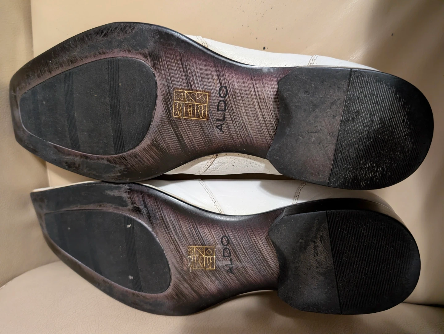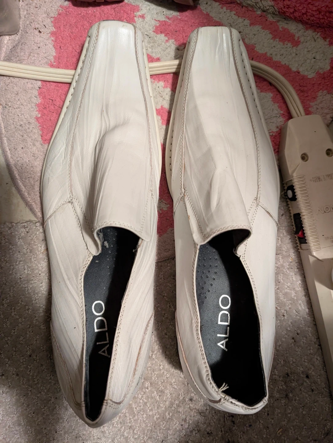 These ALDO white leather loafer dress shoes have a classic slip-on design. Some wear and peeling is visible on the inner lining.