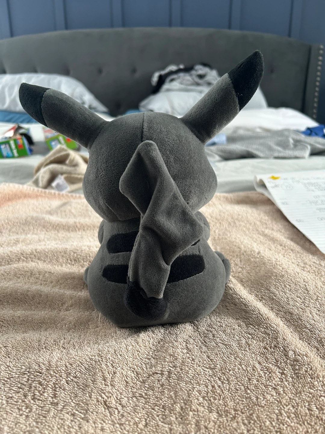 This is a grey Pikachu plush toy. It's made of soft material and features the iconic lightning bolt emblem on its chest. It's a fun collectible for any Pokémon fan!